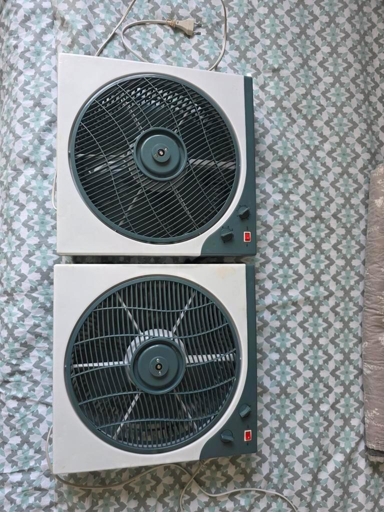 Set van twee vintage tafelventilatoren. Beide ventilatoren werken, maar zonder voet, met gebruikssporen. Ideaal voor de liefhebber
