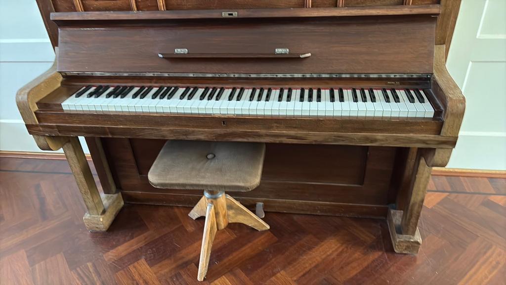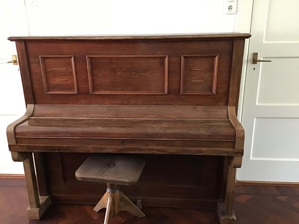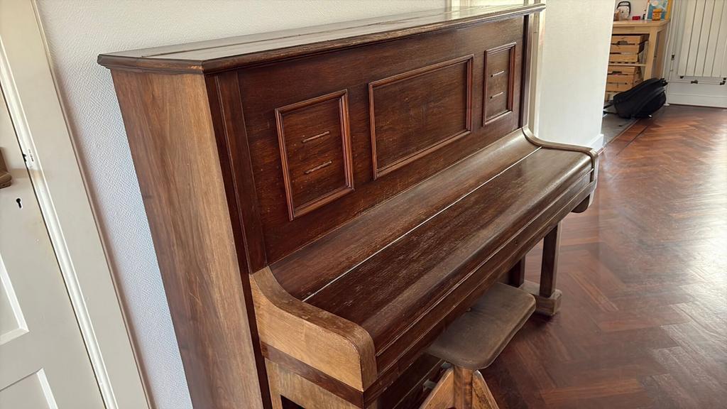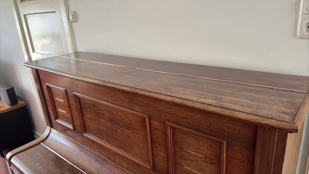 Houten, bruine piano. Prima bespeelbaar maar moet wel gestemd worden. De piano heeft gebruikssporen en de deksel is een beetje bes
