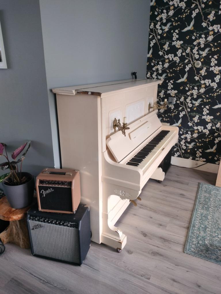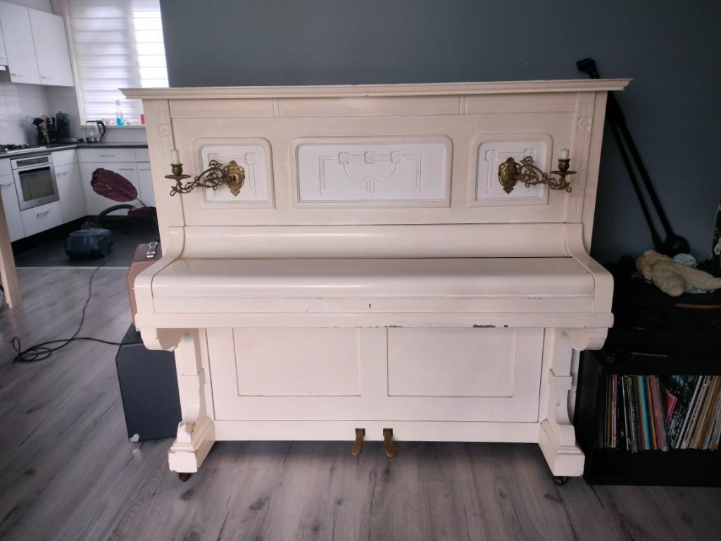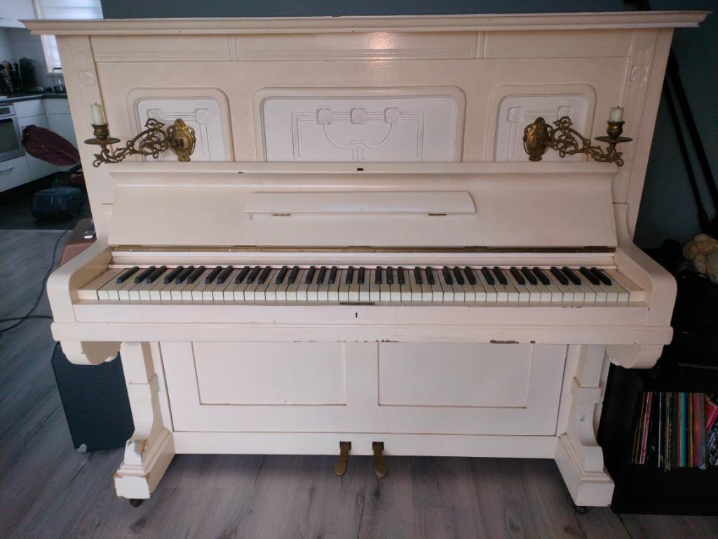 Antieke piano met orginele kaars houders en ivoren toetsen. Moet gestemd worden maar is nog speelbaar.