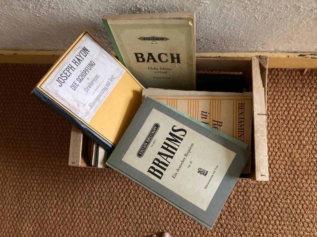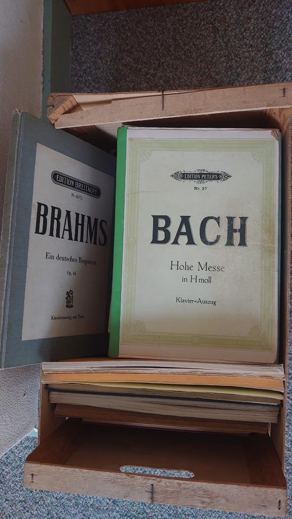 Die schöpfung is al vergeven, rest is nog wel beschikbaar. Kistje vol bladmuziek voor koren, in verschillende talen waaronder duit