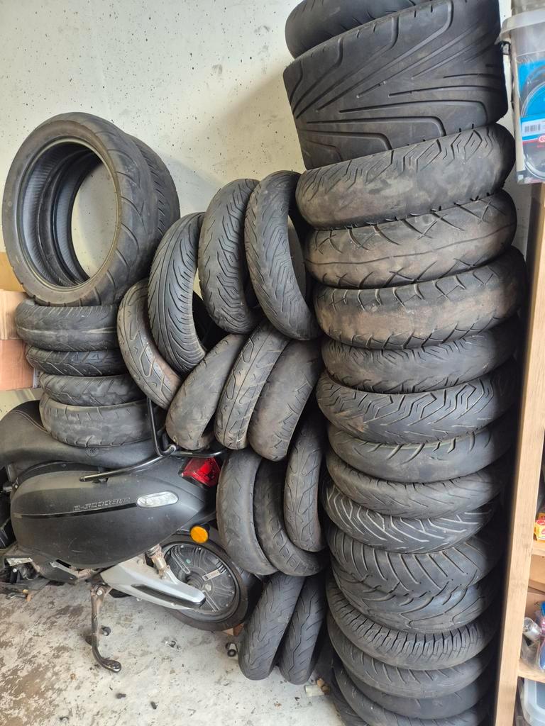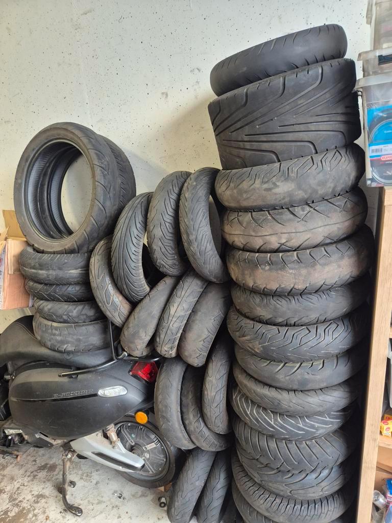 Partij gebruikte scooterbanden. Verschillende maten en merken. Ideaal voor handelaren of hobbyisten. Banden zijn in gebruikte staa
