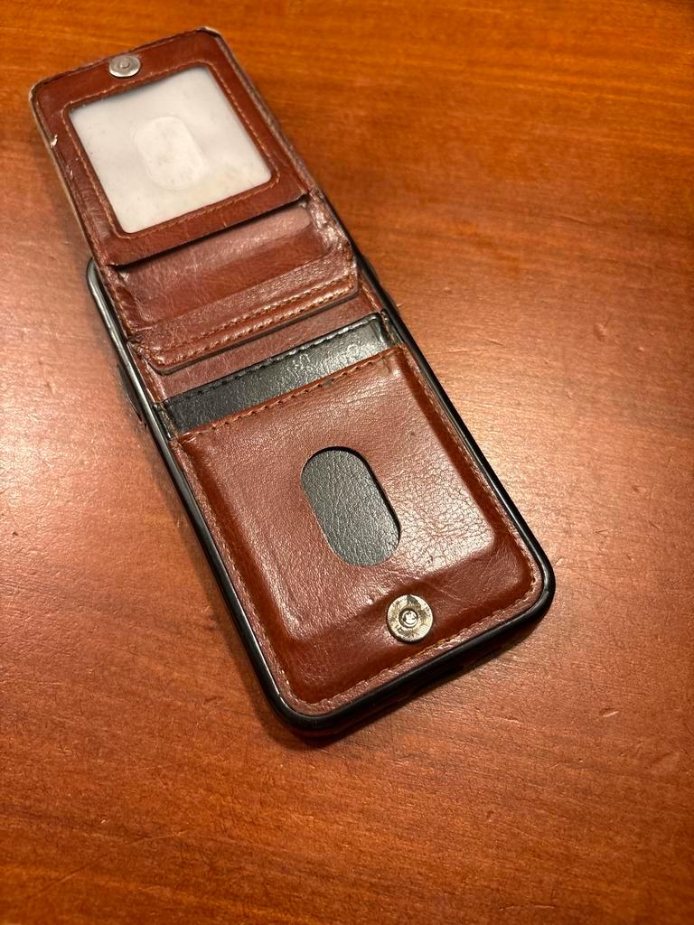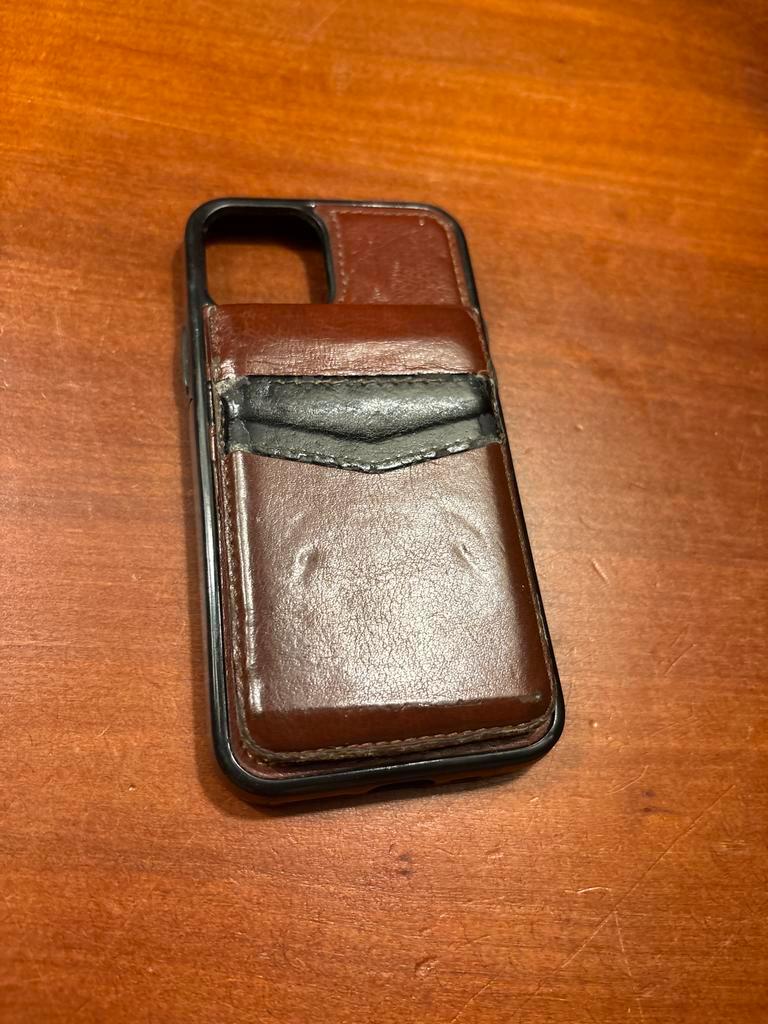 Bruin lederen iphone hoesje met ingebouwde kaarthouder. Geschikt voor iphone 11 modellen. In goede staat.