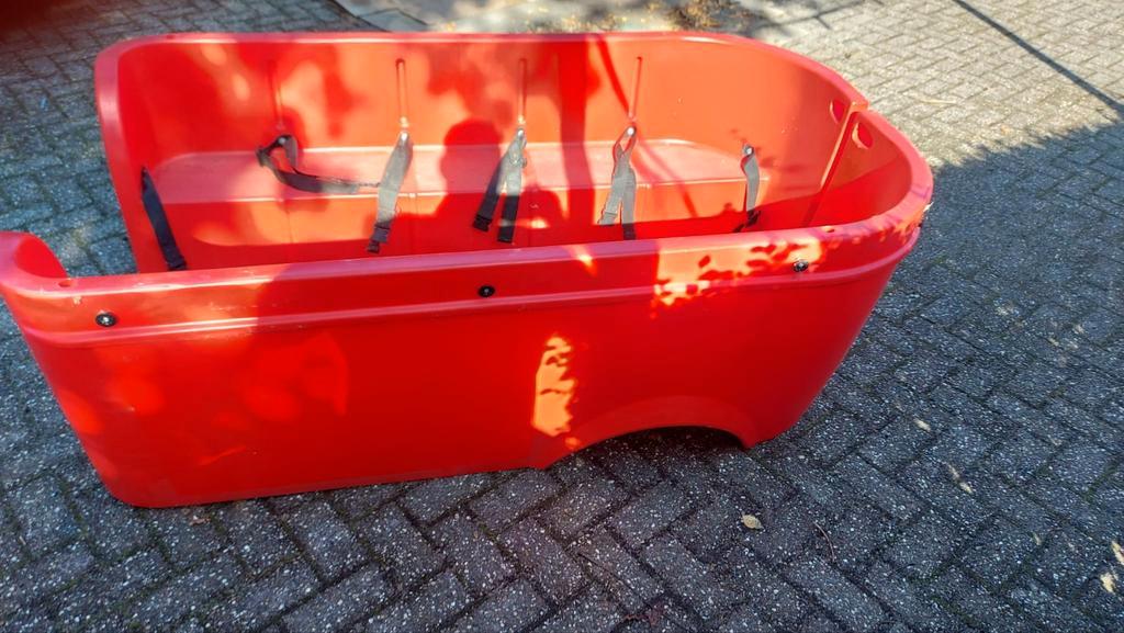 Rode bak voor een stint bakfiets. Geschikt voor het vervoeren van kinderen. De bak is in gebruikte staat, maar nog prima te gebrui