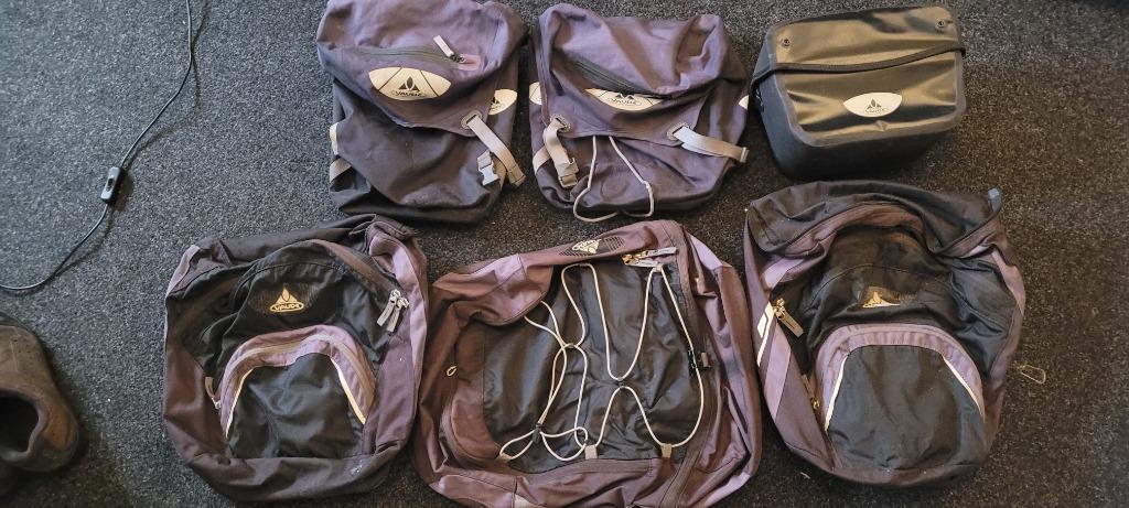 Tassenset van vaude voor het touren. ÉÉN van de twee voortassen is behoorlijk gescheurd, achter (twee zijkanten en een bovenkant)