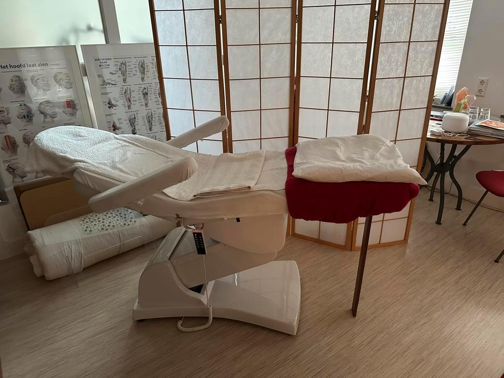 Mooie behandelstoel voor massage. De motoren werken niet, de verwarming wel. Hij is wel te gebruiken, maar blijft in dezefde stand