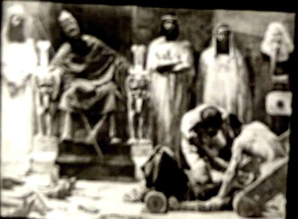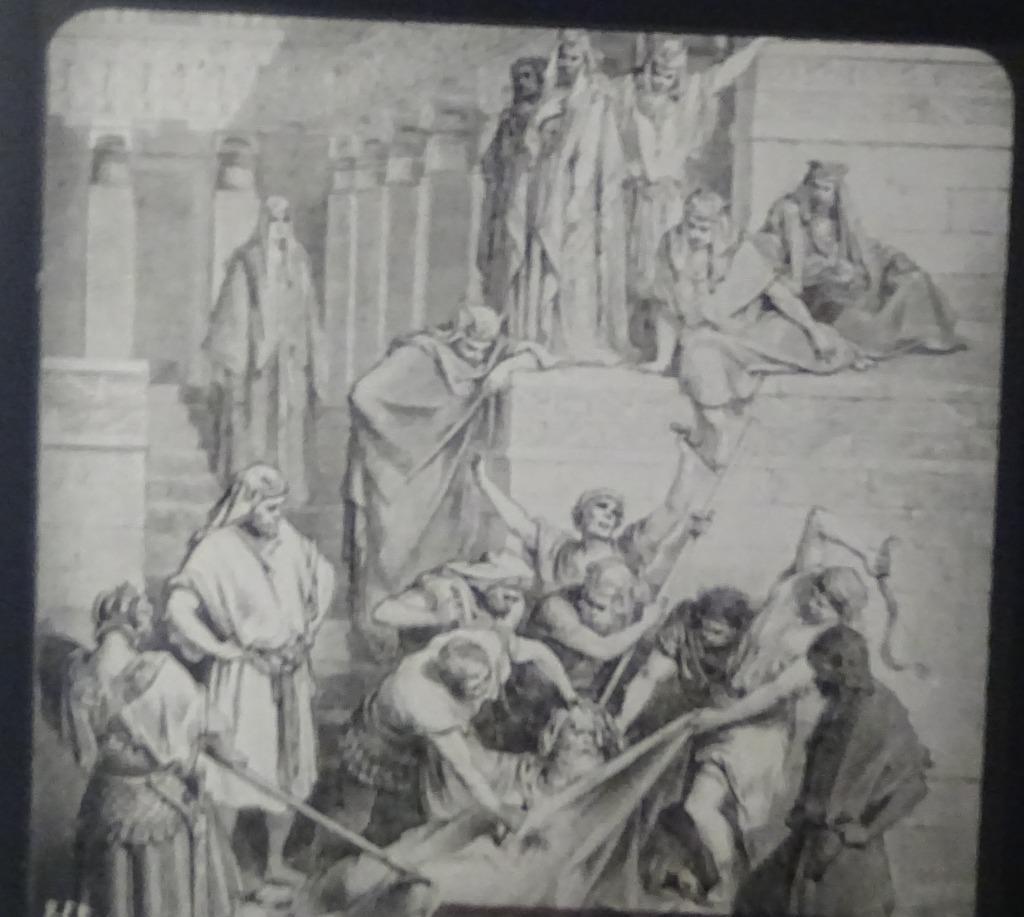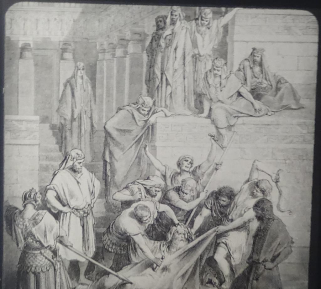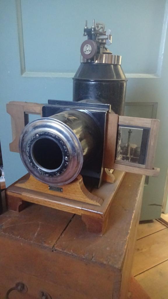 Vintage projector met 14 kistjes met 7x7 tussen glasplaatjes geraamde dia''s van gustaaf doré en van romeinse objecten.. De pro