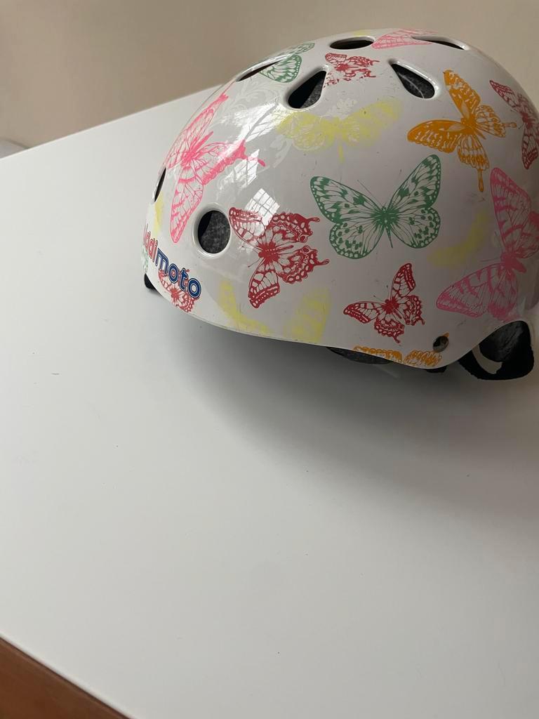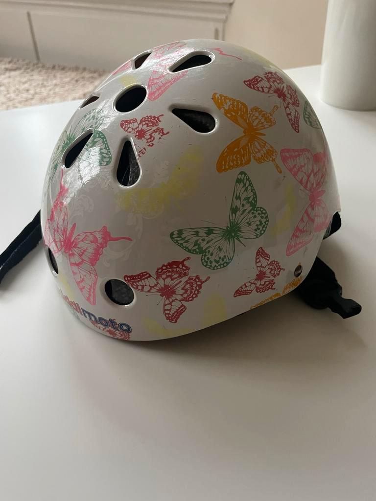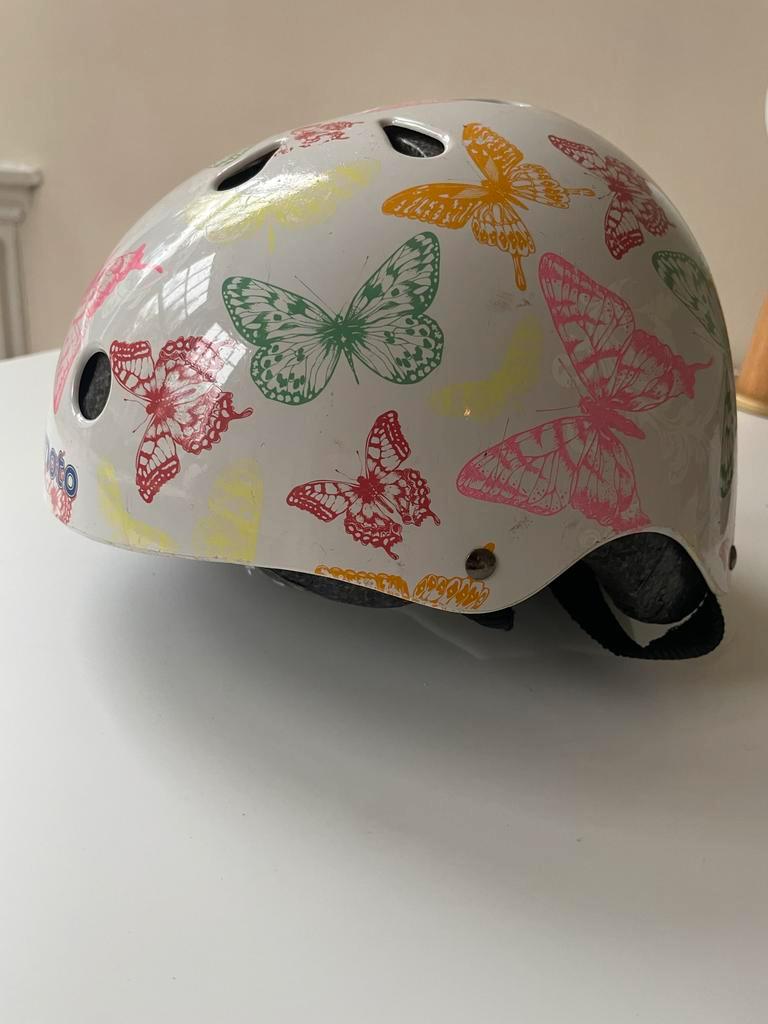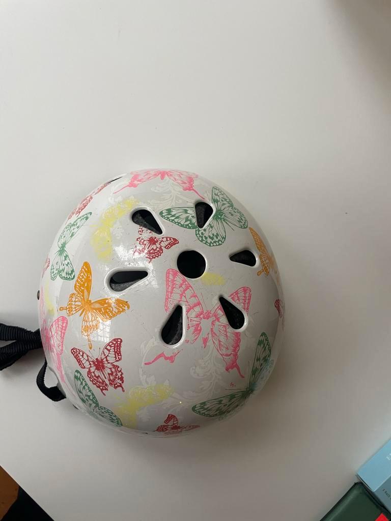 Leuke kinderfietshelm met vlinderprint. Geschikt voor kinderen met een hoofdomtrek van 48-53cm. De helm is in goede staat en biedt