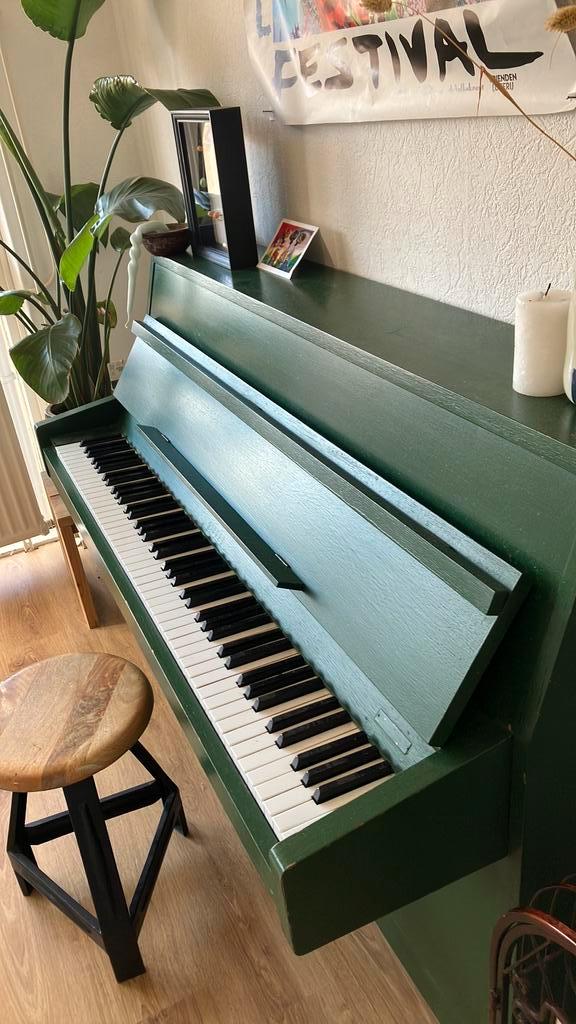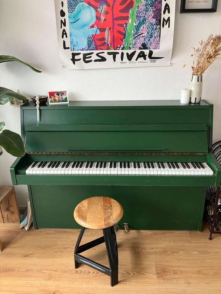 Groene piano, vooral leuk als uniek meubelstuk :) helaas klinkt hij behoorlijk vals en is het geluid wat gedempt. Linkerzijkant is