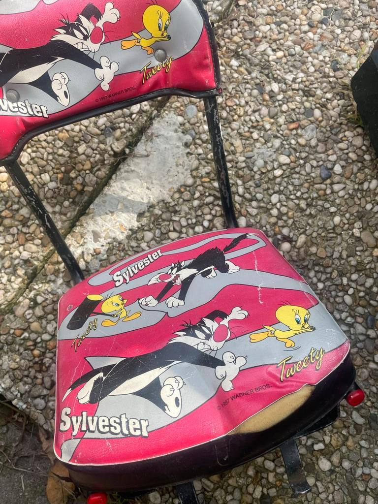 Vintage fietsstoeltje met sylvester en tweety print. Gebruikt, maar nog steeds leuk voor een retro fiets.