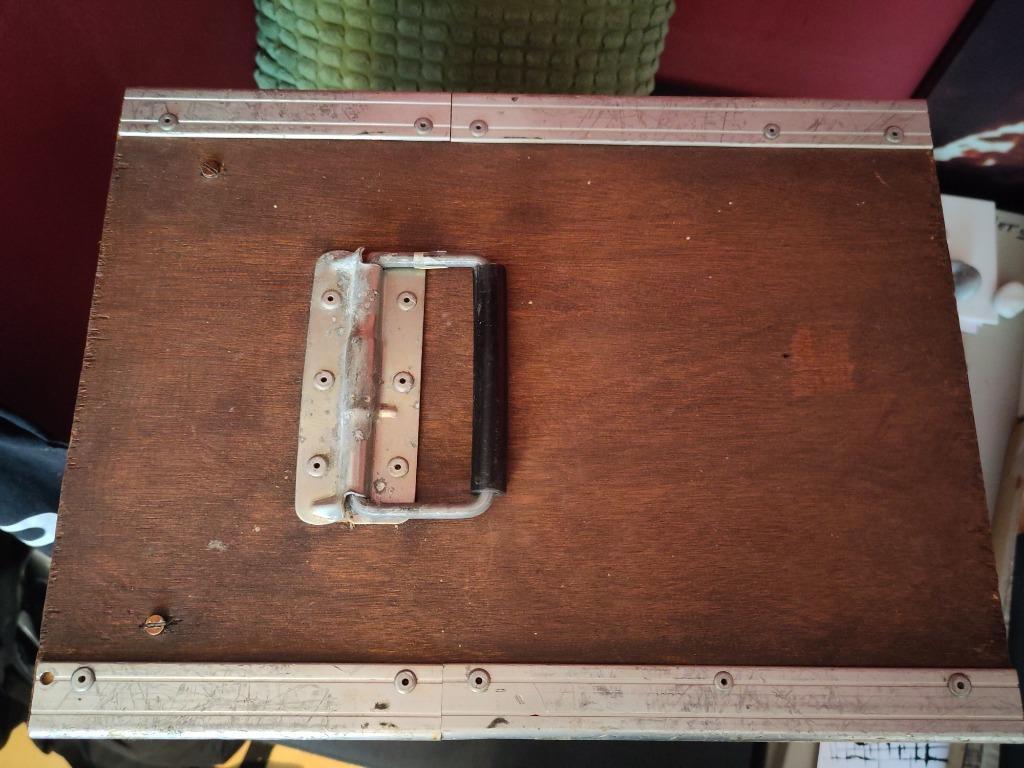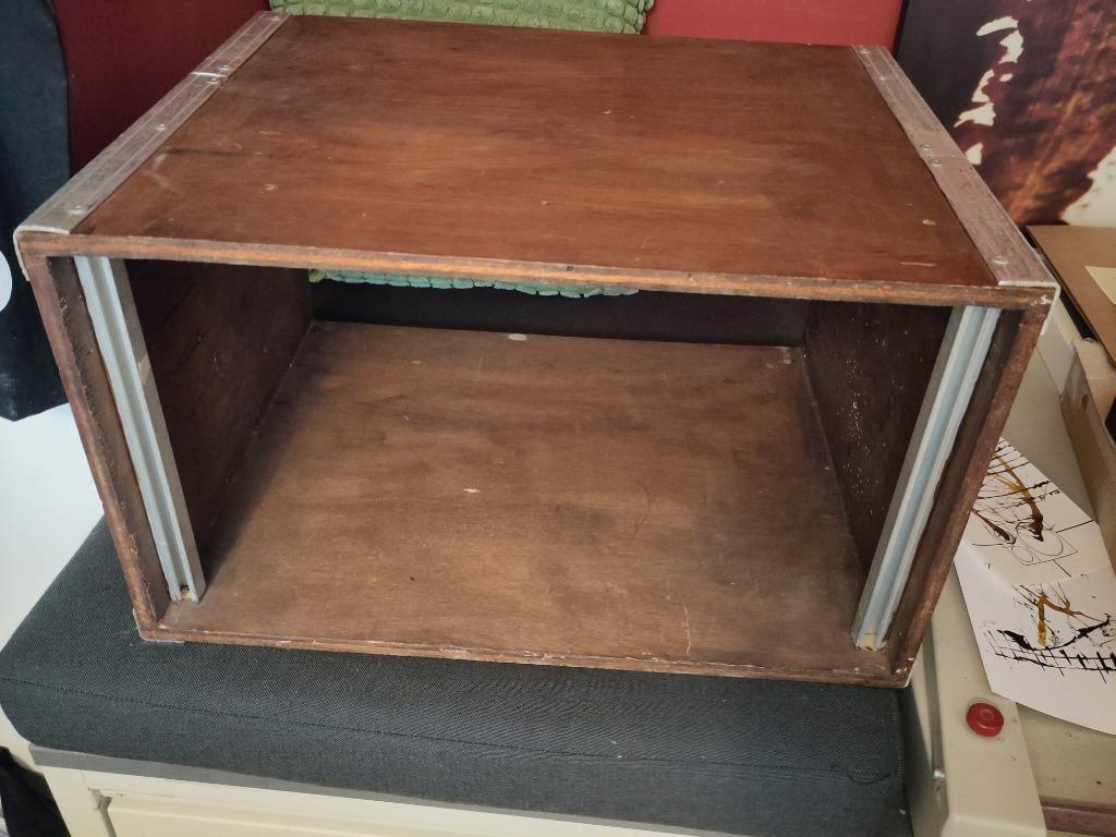 Stevige houten 19inch kist met handvatten. Goed te gebruiken als flight case. Met aan één kant rails alleen op te halen zie ook mi