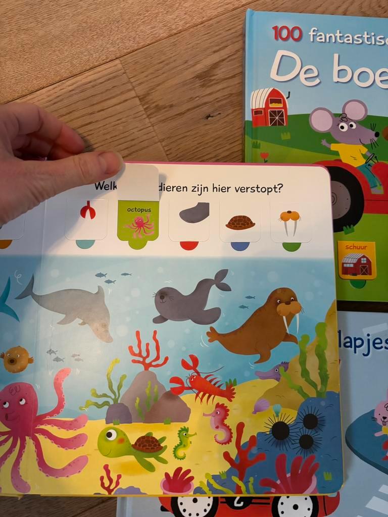3 boeken: dieren, de boerderij, voertuigen. Veel gebruikt -> er zijn gebruikssporen