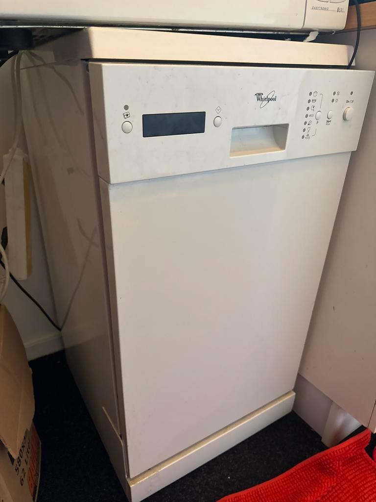 Witte vaatwasser van 45 cm breed. De vaatwasser werkt perfect, maar heeft geen waterstop. Kan vandaag of morgen opgehaald worden.