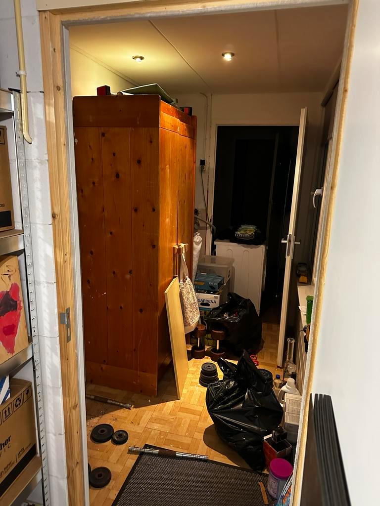 Degelijke massief grenen kledingkast, vermoedelijk zo''n 35 jaar oud. Nog steeds functioneel, maar overbodig geworden wegens aa