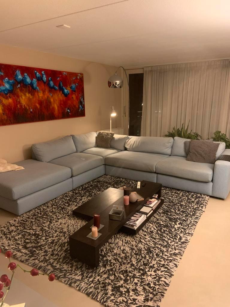 Ruime, lichtblauwe loungebank met afmetingen 325cm x 300cm. Ideaal voor een grote woonkamer en biedt veel zitplaatsen. Comfortabel