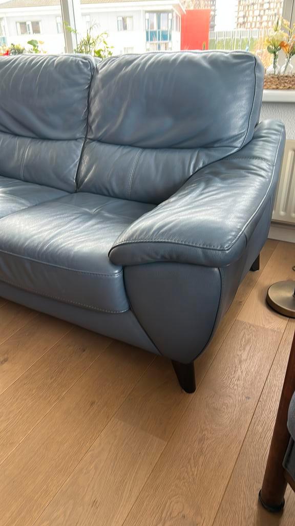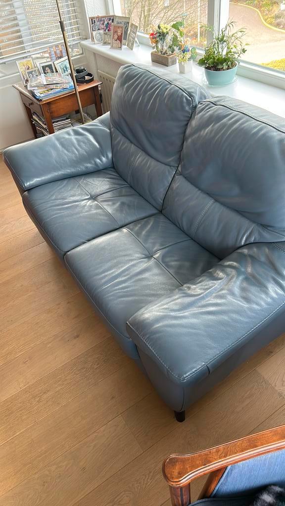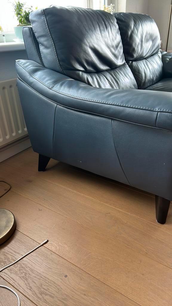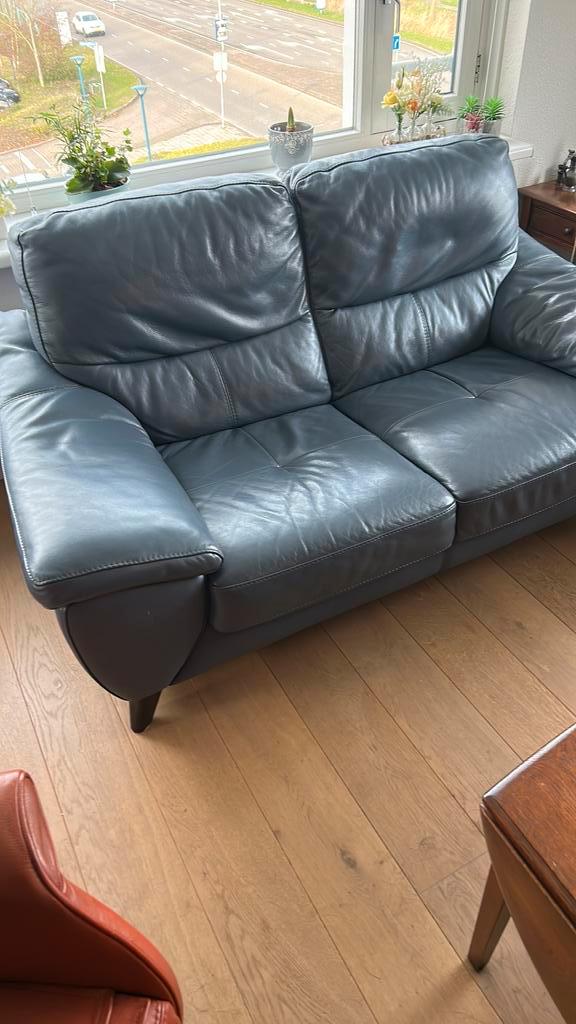 2 persoons bankje in goede staat. Blauw leer. Houten poten. Zitdiepte 55, lengte 170 (incl armleuningen) en hoogte 100 en zithoogt