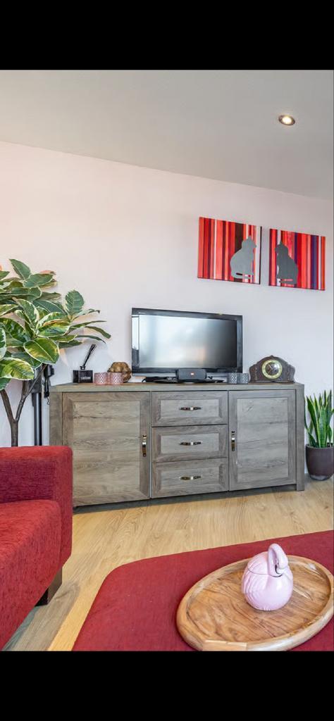 Mooie dressoir met een breedte van 165,5 cm, een diepte van 44 cm en een hoogte van 85 cm. De dressoir is voorzien van 2 legplanke