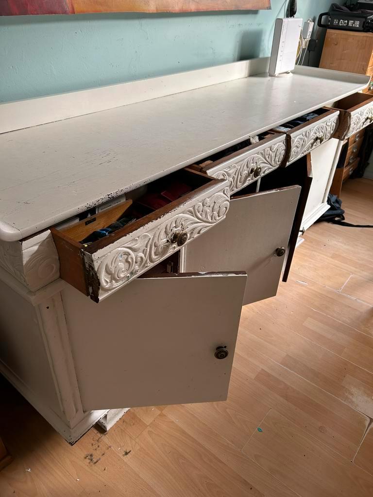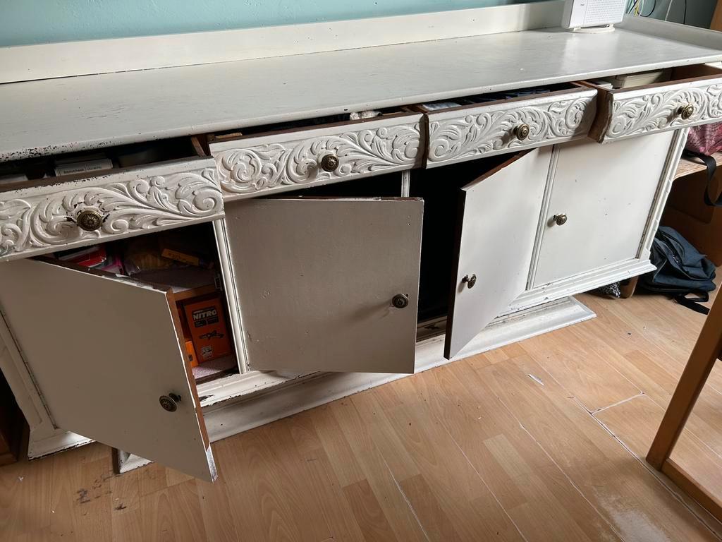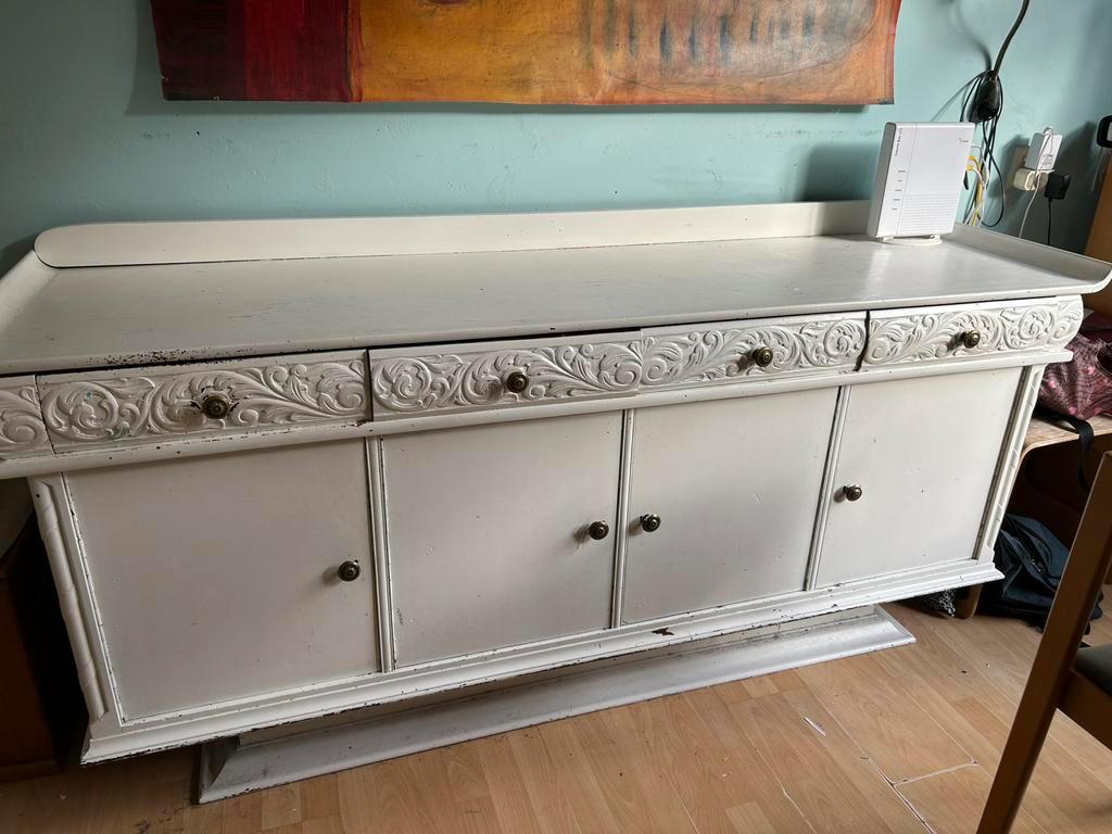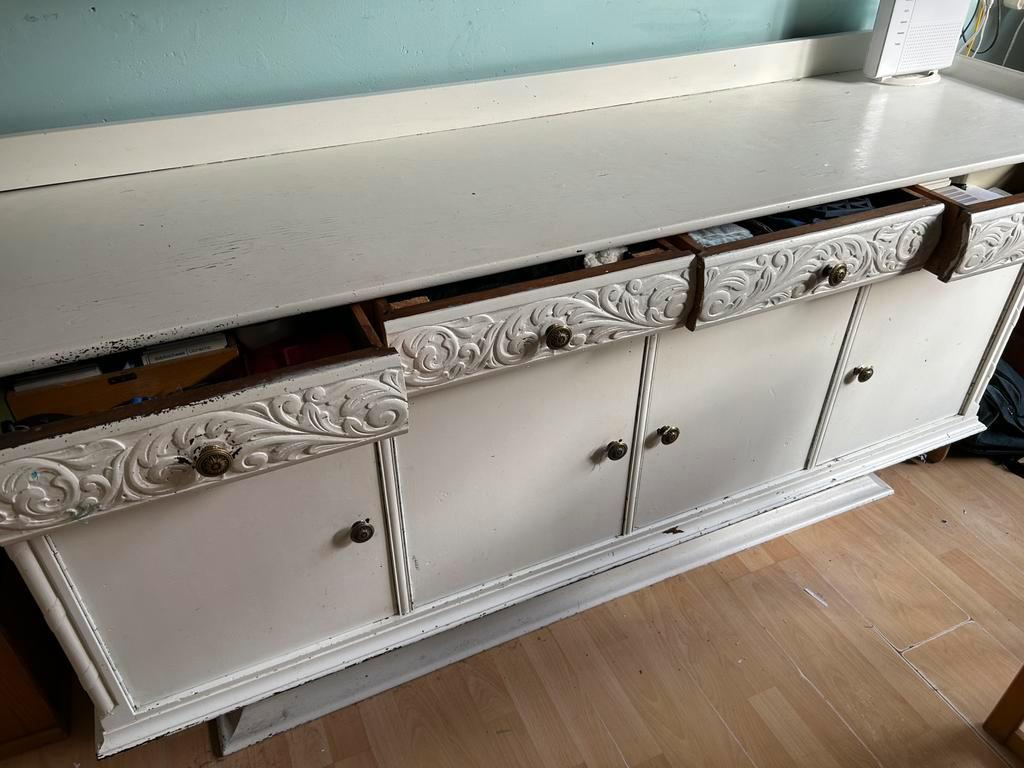 Oud dressoir. Wit geverfd. Maar een niet al te dikke laag dus goed op te knappen. Je kunt er veel in kwijt. Wegens renovatie van o