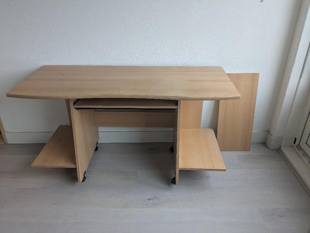 Bureau met lade en planken op de zijkanten. Licht gebruikt - een paar watervlekken maar nog volledig functioneel. Heeft wieltjes v