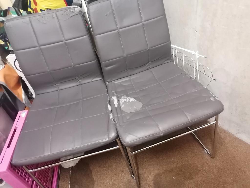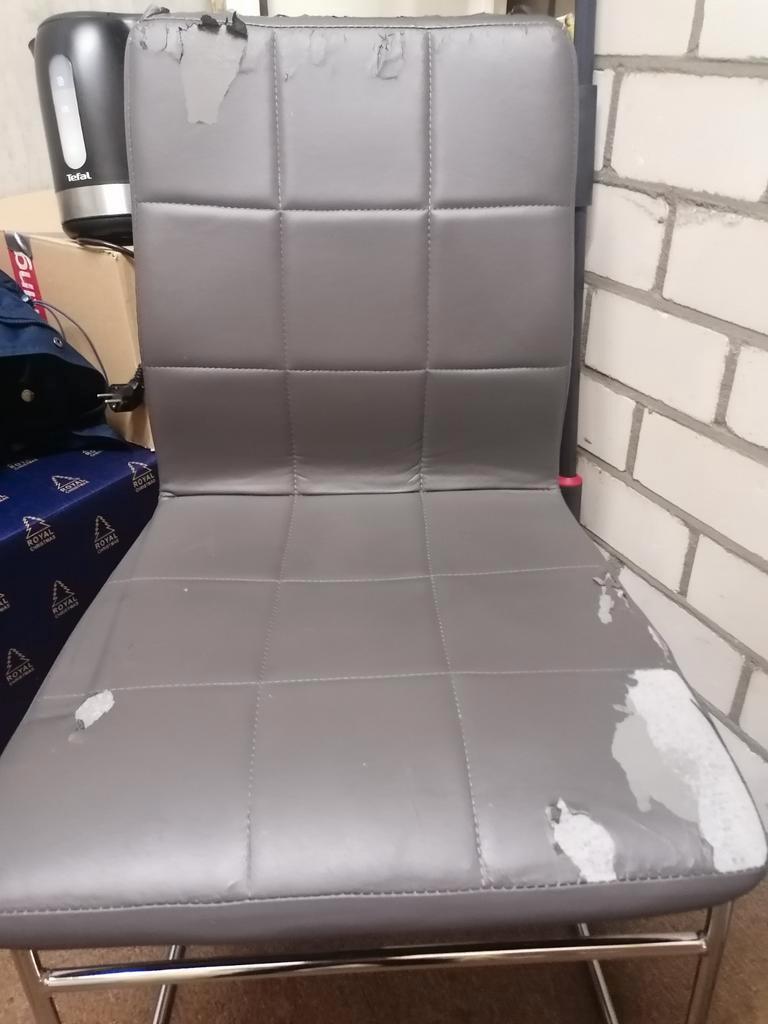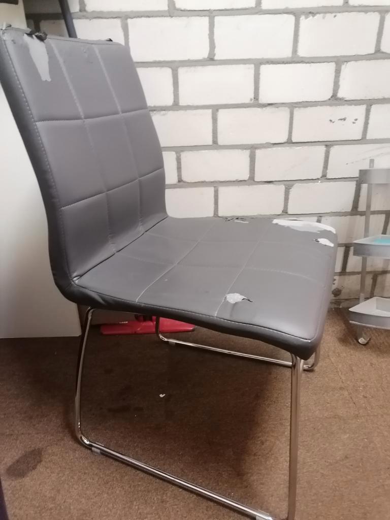 Grijze stoel met metalen poten. De stoelen zijn gebruikt en hebben beschadigingen aan de zitting en rugleuning. Zie foto''s voo