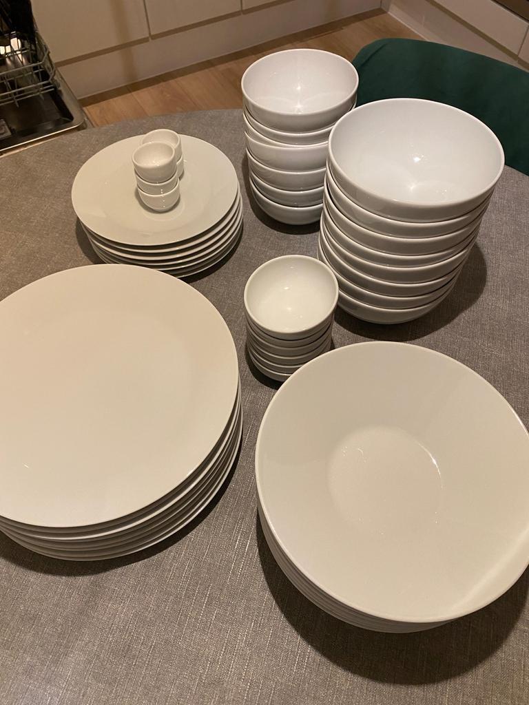 8 grote borden, 7 diepe borden, 7 kleine borden 8 grote kommen, 7 medium kommen, 6 kleine bakjes 5 eierdopjes. Gebruikt, maar ziet