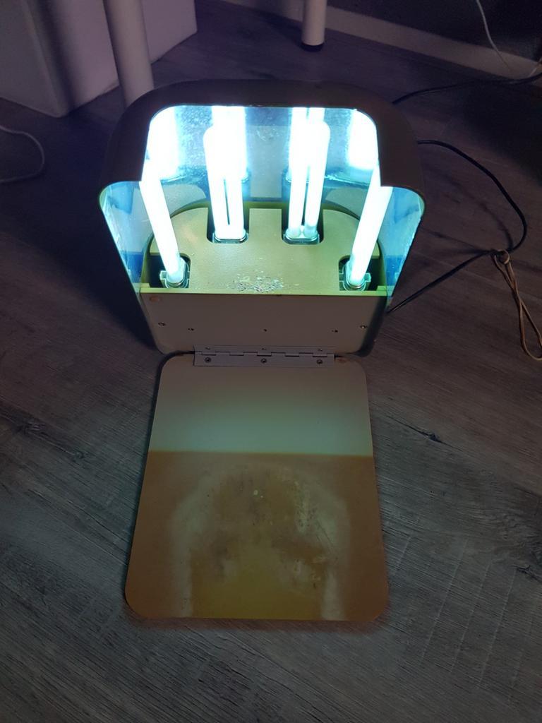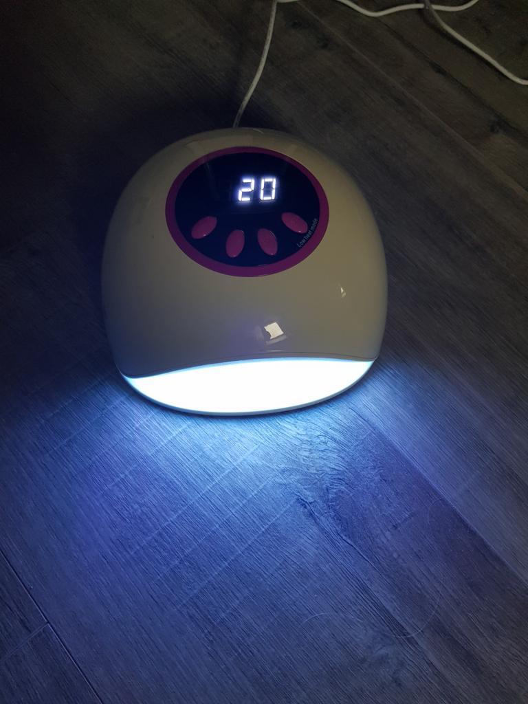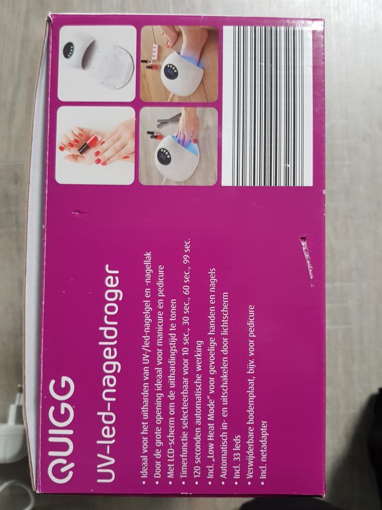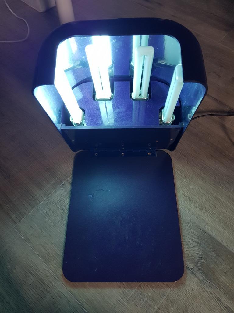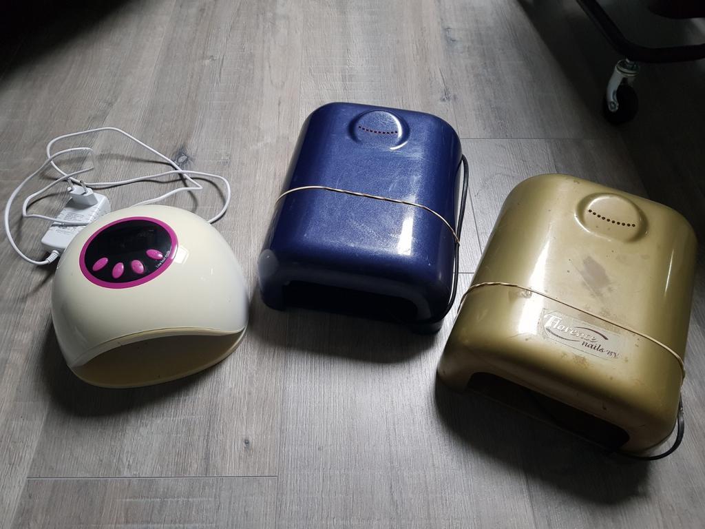 1x witte uv-led nageldroger is wat verkleurd maar werkt goed, zonder doos 2x uv nagellampen blauw en groen bij blauw doen 2 lampen