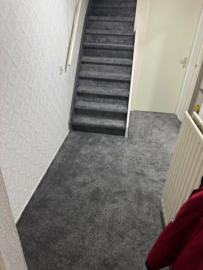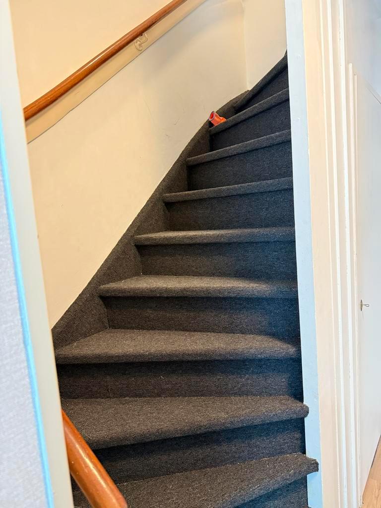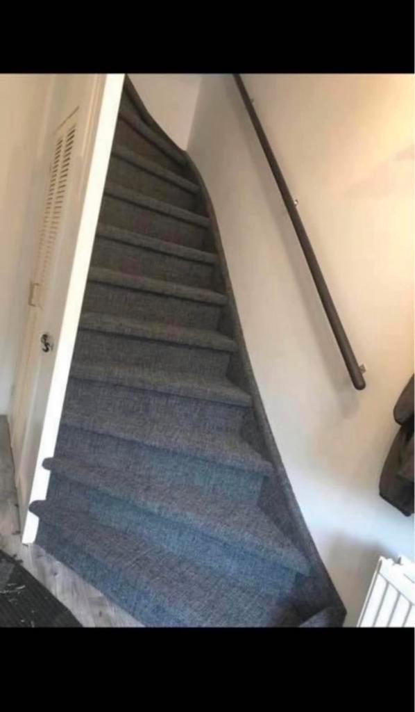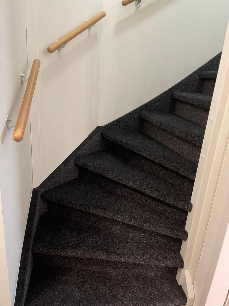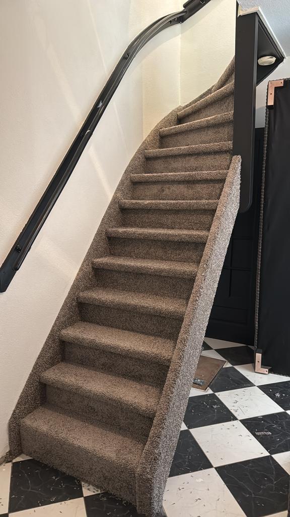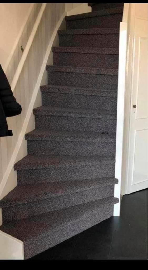 12 treden dichte trap nietjes leggen zondertapijt 200€ zijkanten 75€ elke treed na12 : 20€ lijm 85€ ondervloer