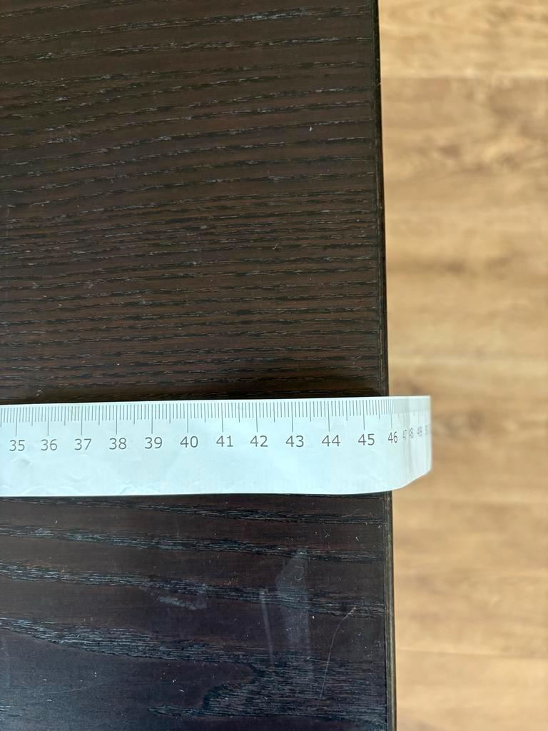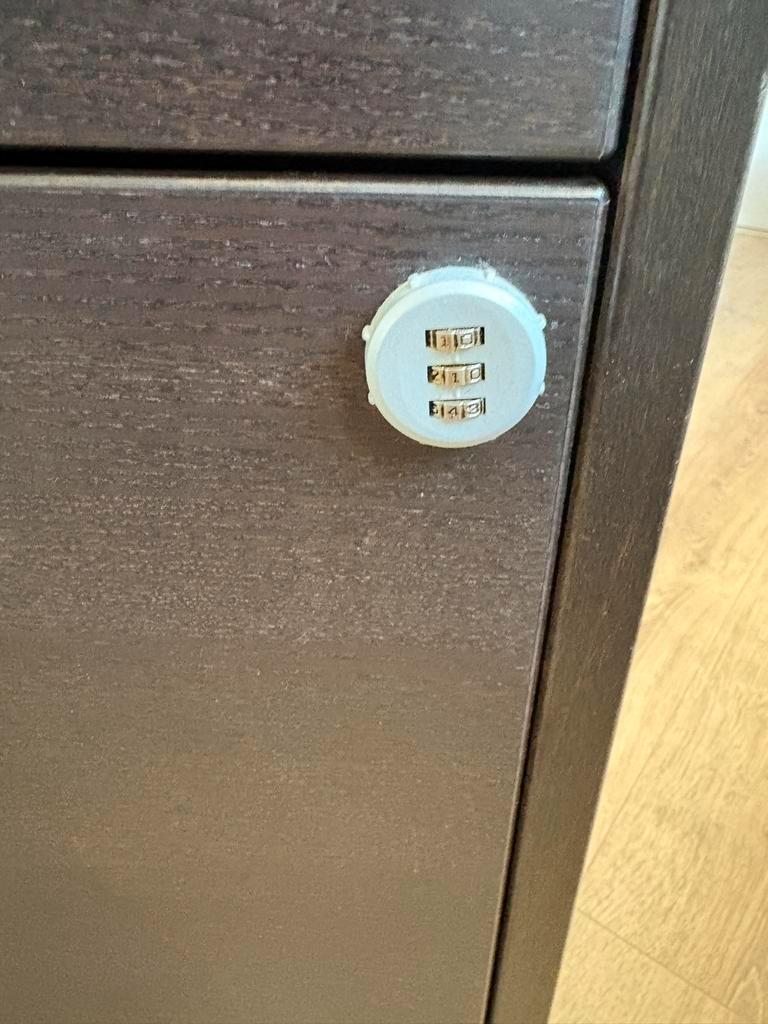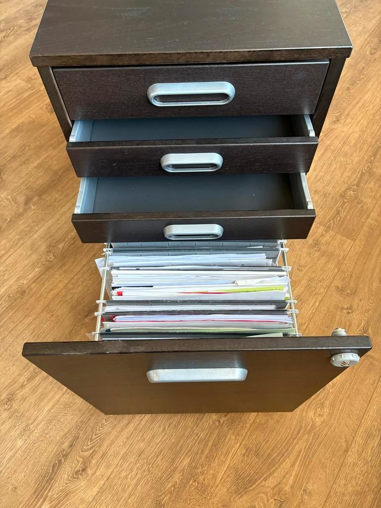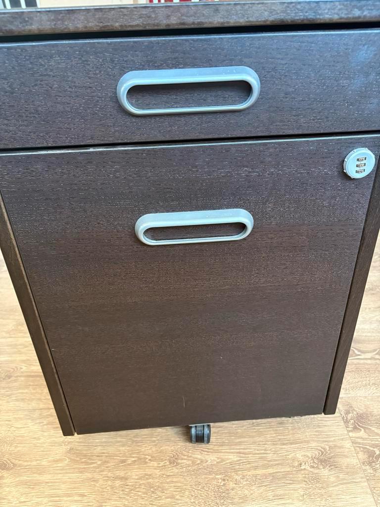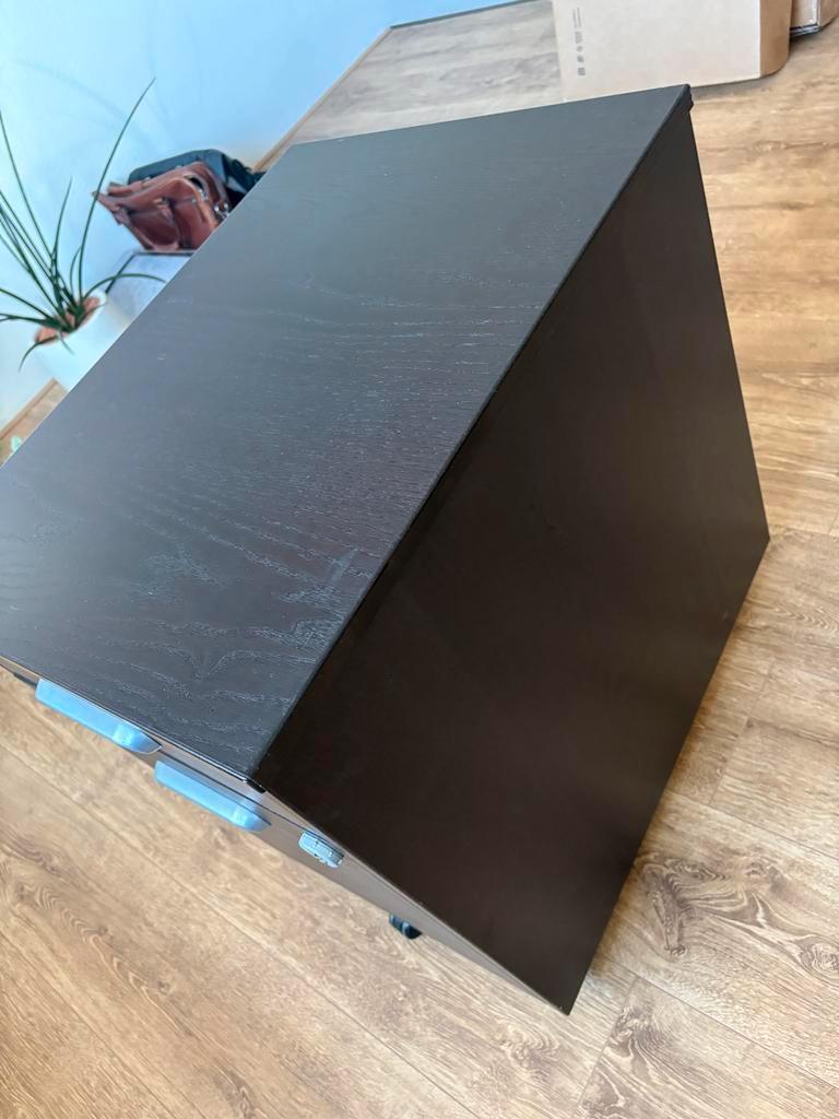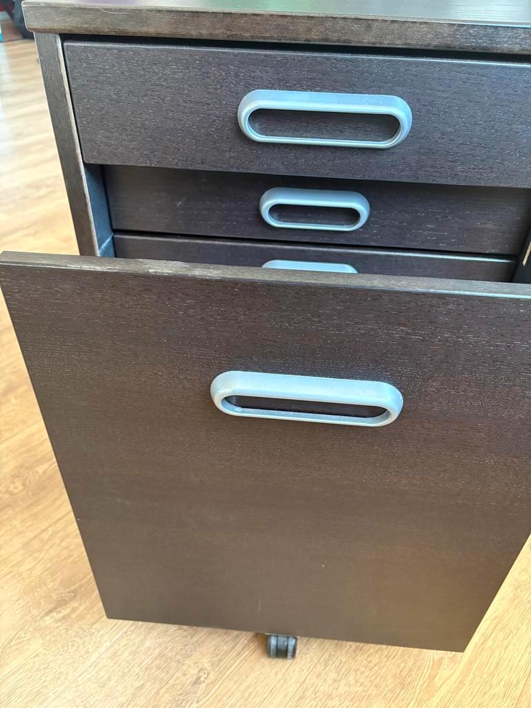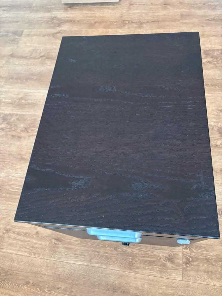 Donkerbruine/zwarte ladekast met drie lades. De onderste lade is voorzien van een slot. De kast is in gebruikte staat, maar functi