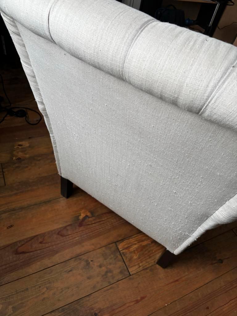 Comfortabele fauteuil die een nieuwe bekleding nodig heeft. De huidige stof is beschadigd door een kat. Verder is de fauteuil in g