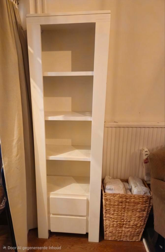 Leuke witte houten kast met 2 lades. De kast is overbodig geworden en is in goede staat. Afmetingen: h 200 x d 35 x b 60 cm. De ka