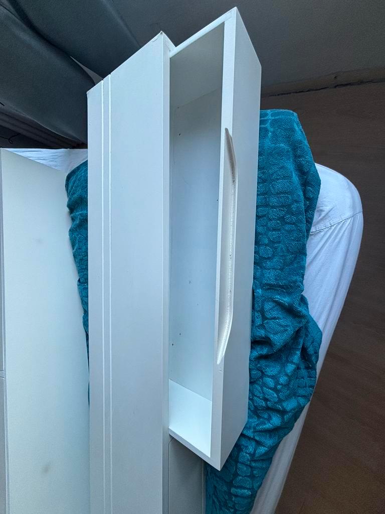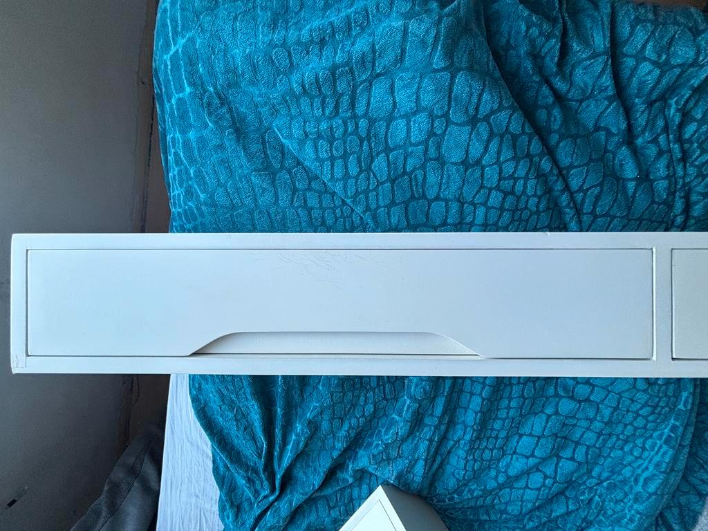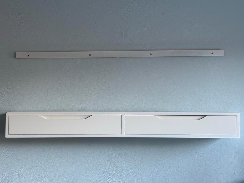 Strakke witte zwevende lades, bij ons op de slaapkamer gebruikt, nu overbodig wegens verbouwen. Materiaal mdf. 120 Cm lang diep 20