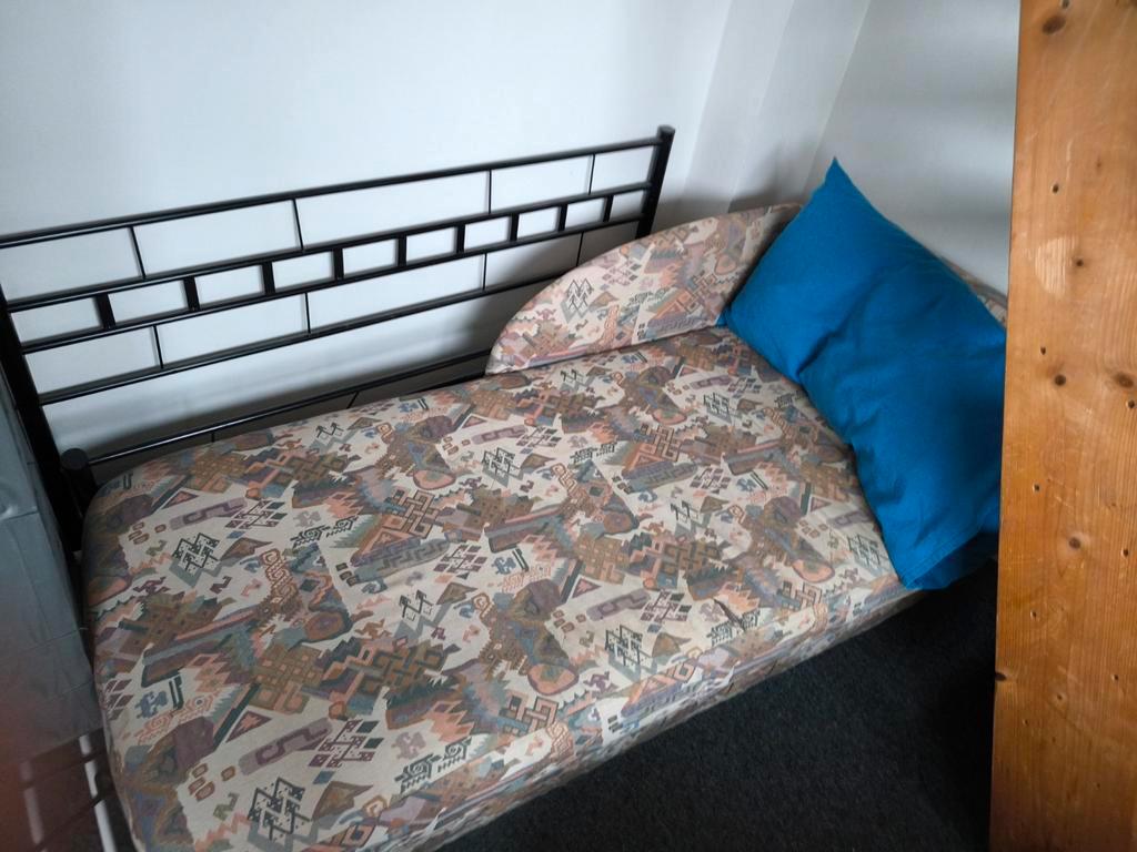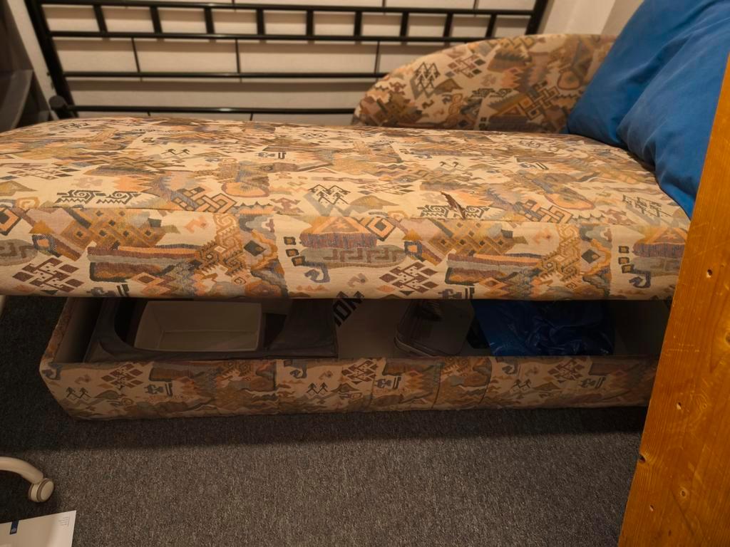Een bank die ook omhoog kan worden geklapt, zodat je er spullen op kunt zetten. Hij is ongeveer 170 cm lang. In goede staat.