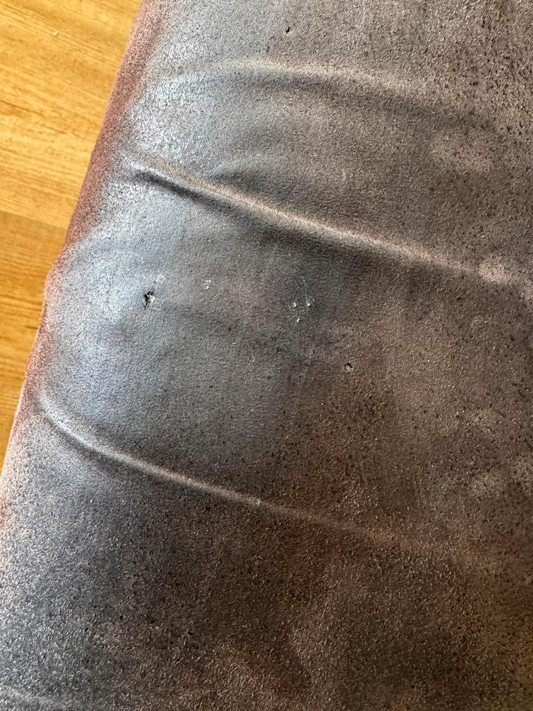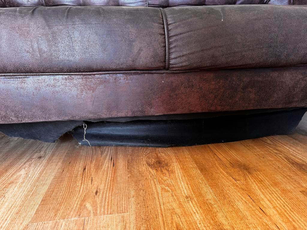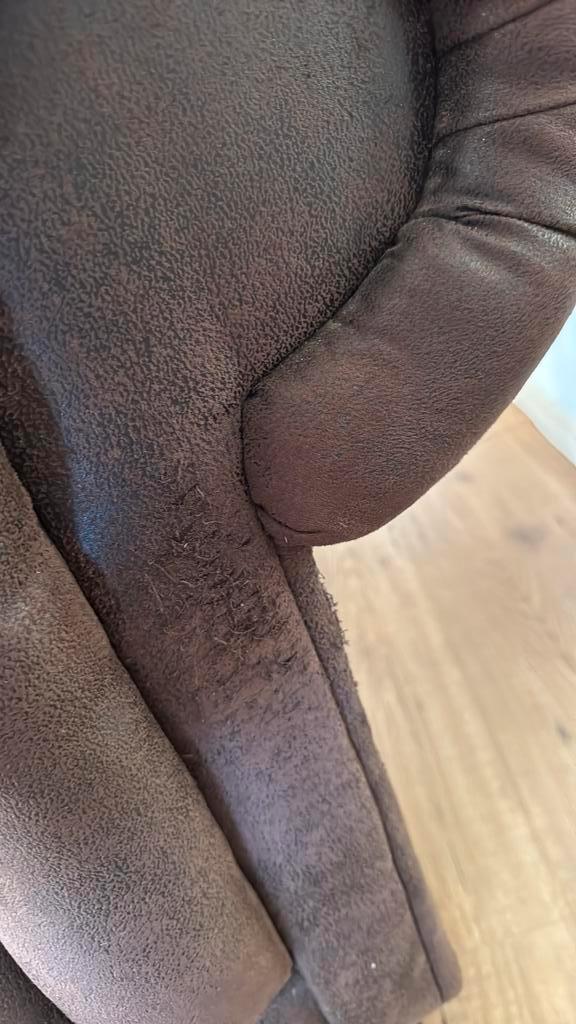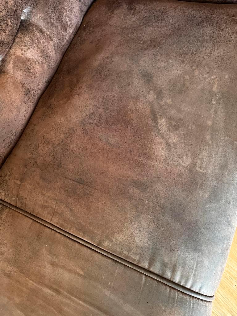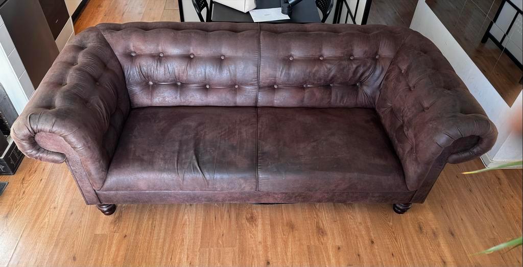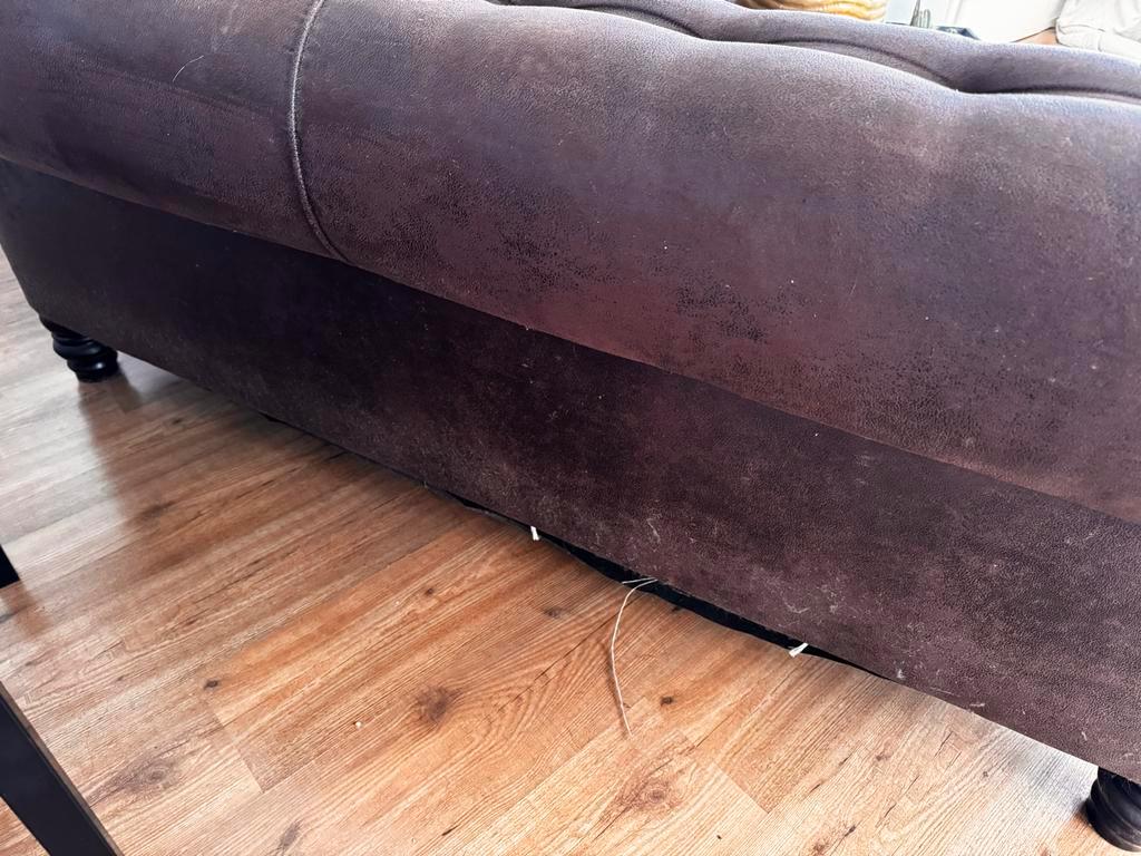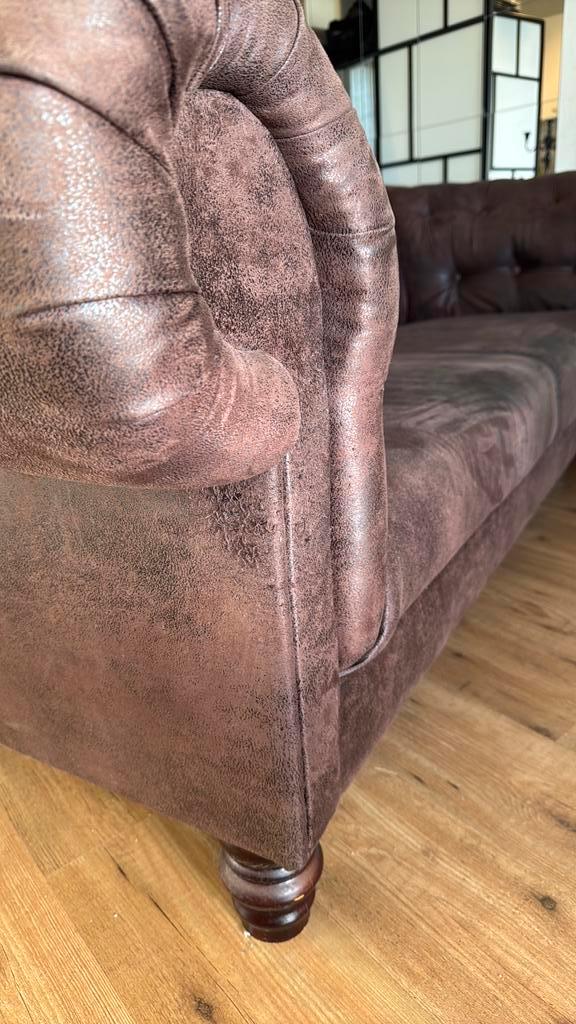 Bruine chesterfield bank van suède. De bank heeft een vlek en twee kleine gaatjes. De onderkant is door een kat open gescheurd. Mo