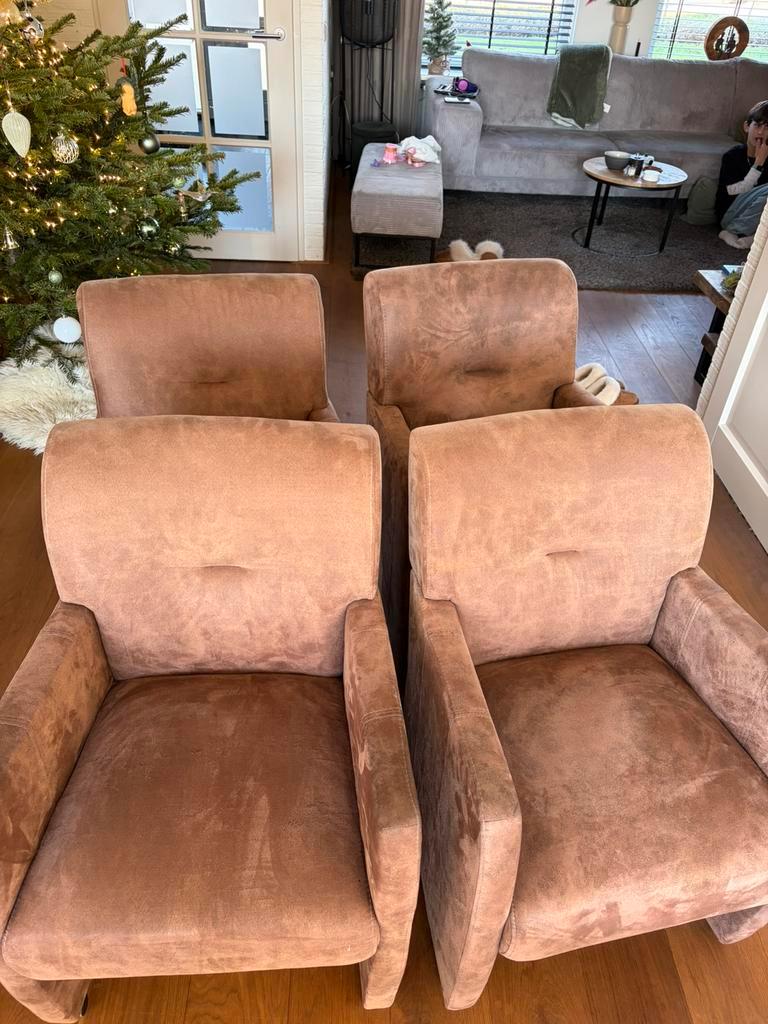 4 x gebruikte eetkamer stoelen, zijn in goede staat en zitten heerlijk. Hier en daar zit er een gaatje, maar ze gaan zeker nog wel