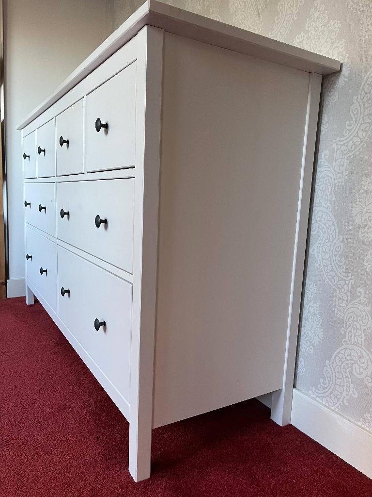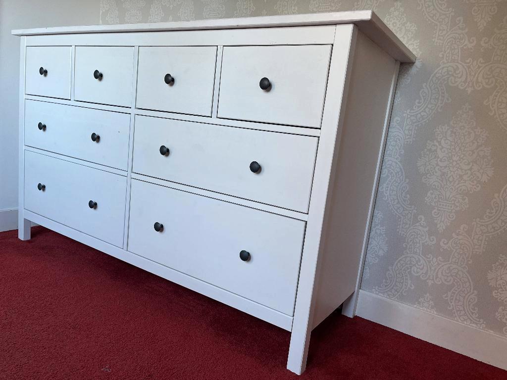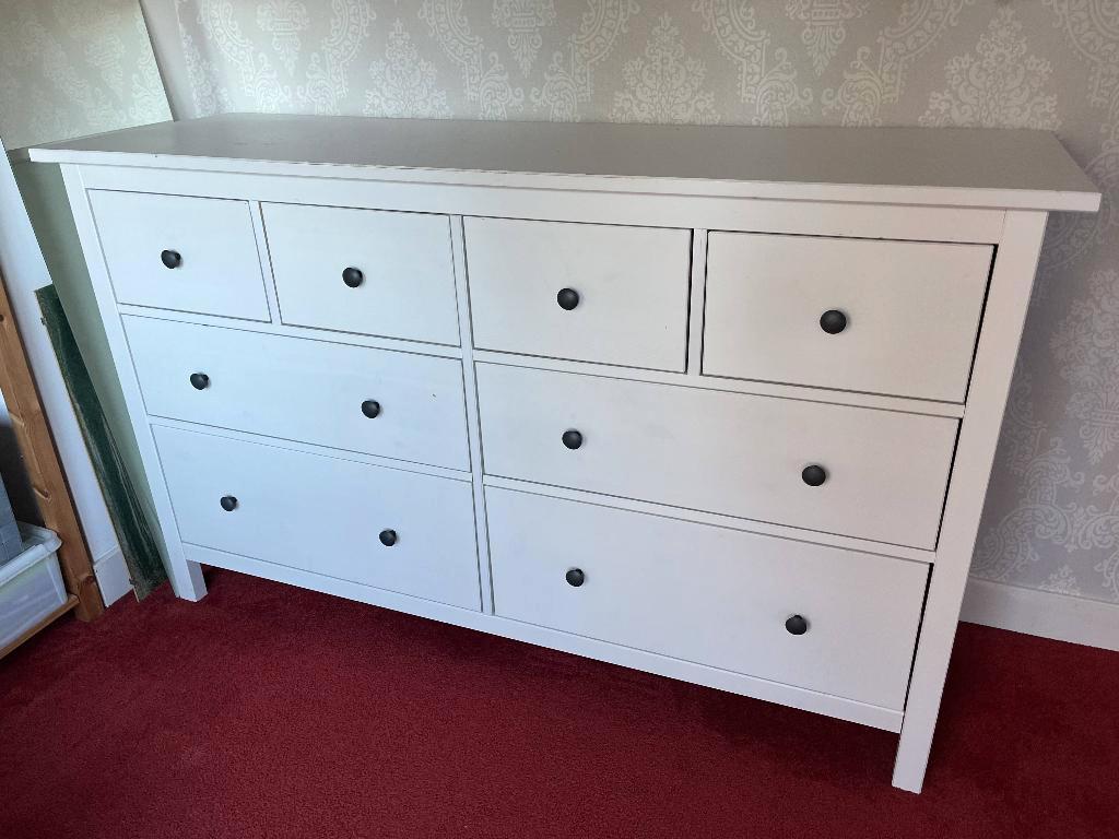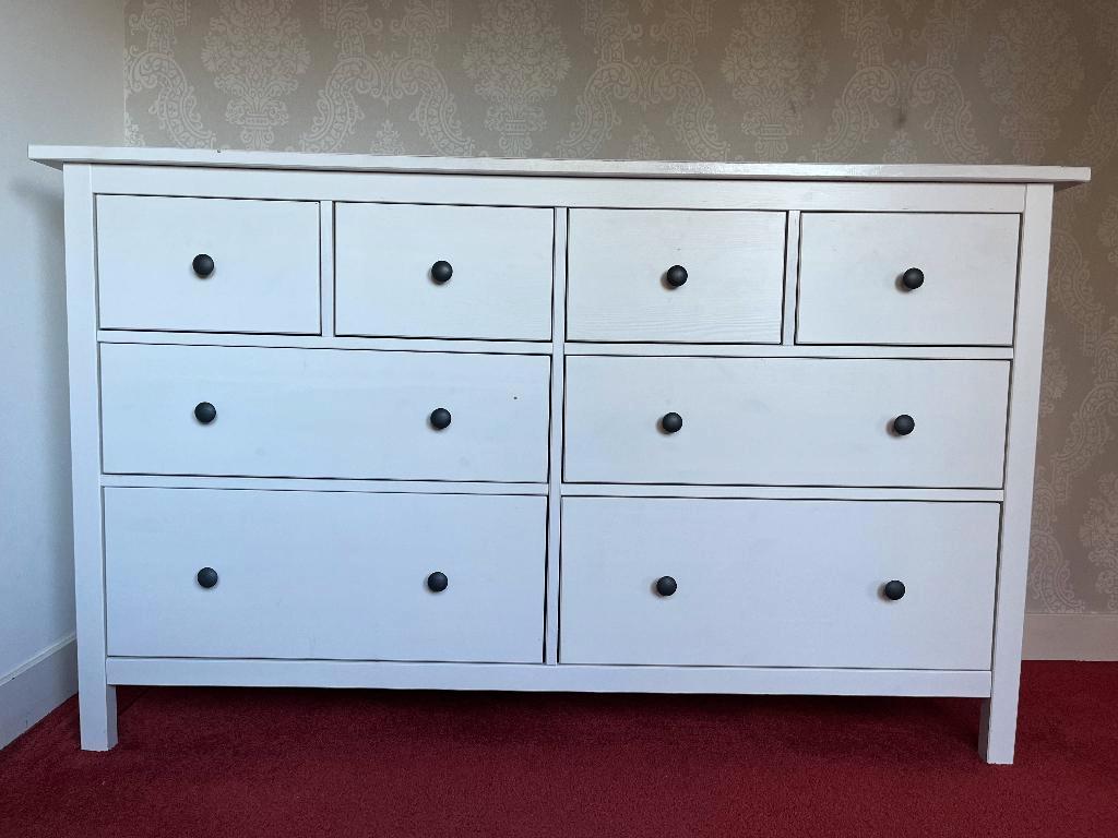 Gratis af te halen: witte houten ladekast, met enkele lichte beschadigingen, met name op het bovenblad. Afmetingen: 160 cm lang, 5