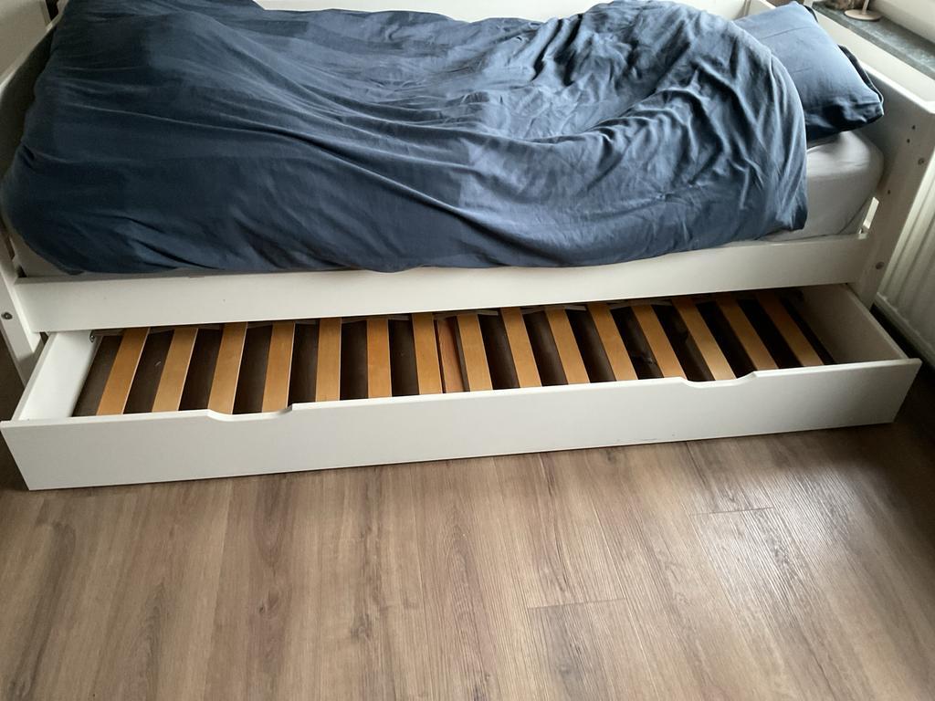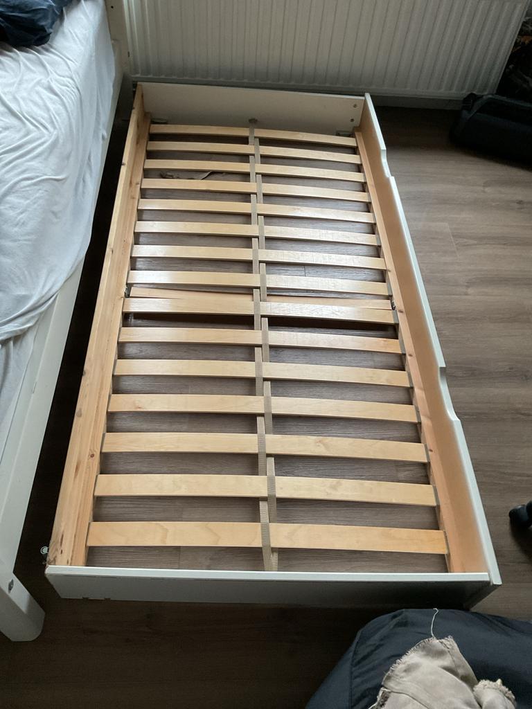 Handige bedlade logeerbed lattenbodem.gratis af te halen zonder matras. Afmetingen zijn standaard voor een eenpersoonsbed. Kleur i