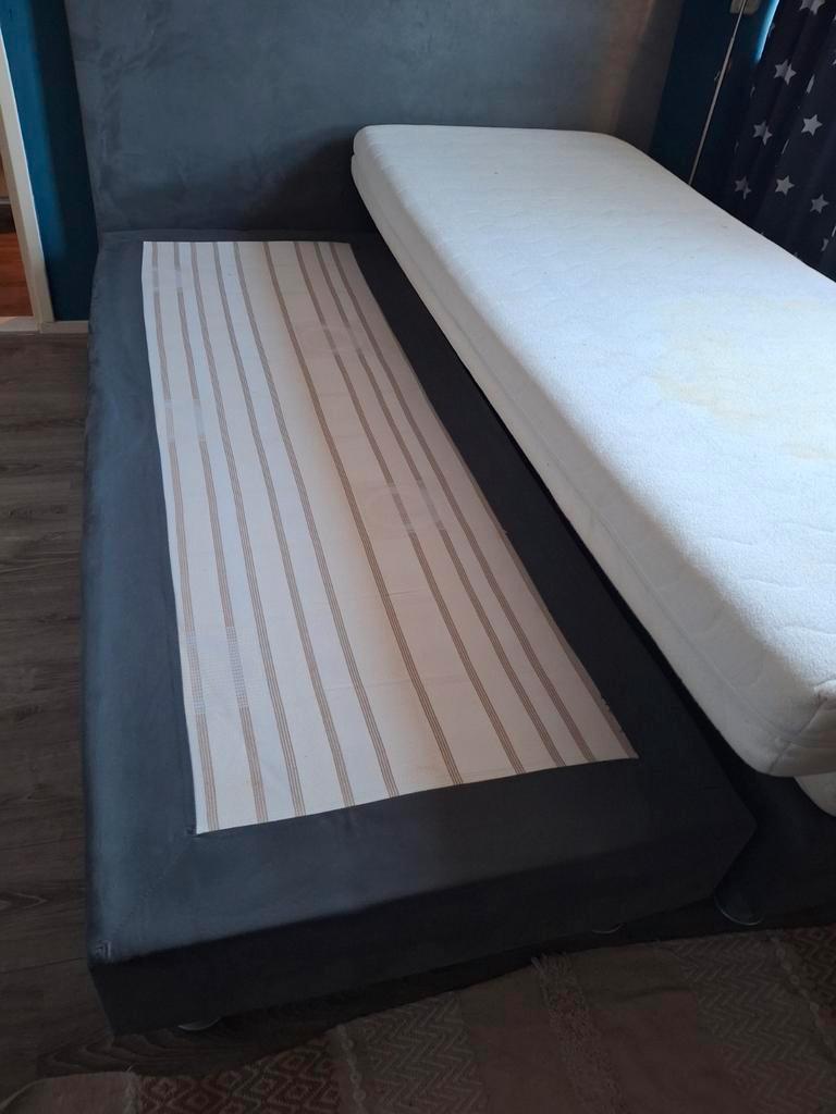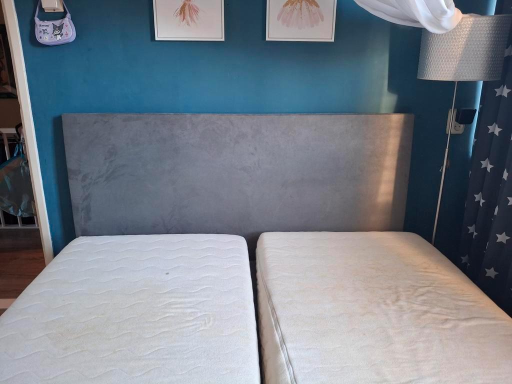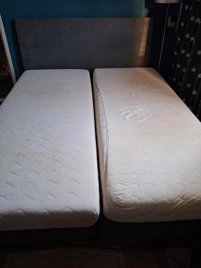 Complete boxspring combinatie bestaande uit twee losse onderstellen, een hoofdbord en twee matrassen van 80 cm breed. Geschikt voo