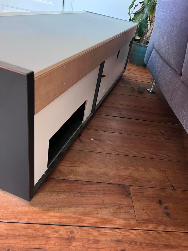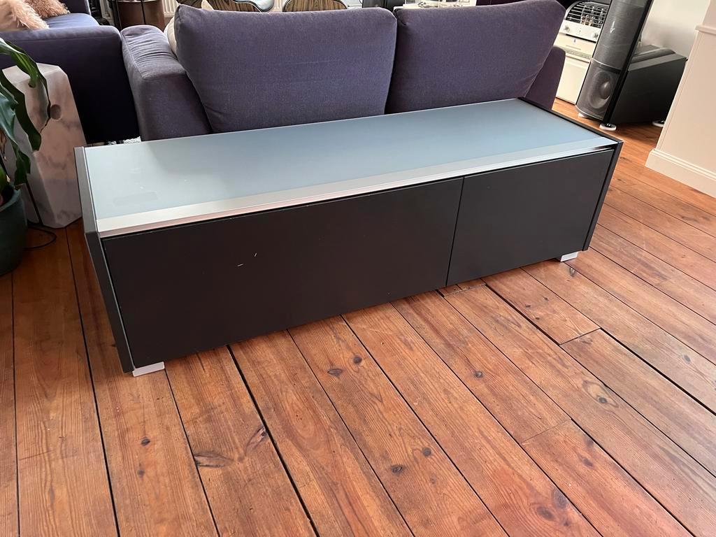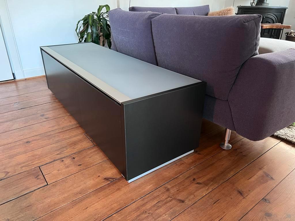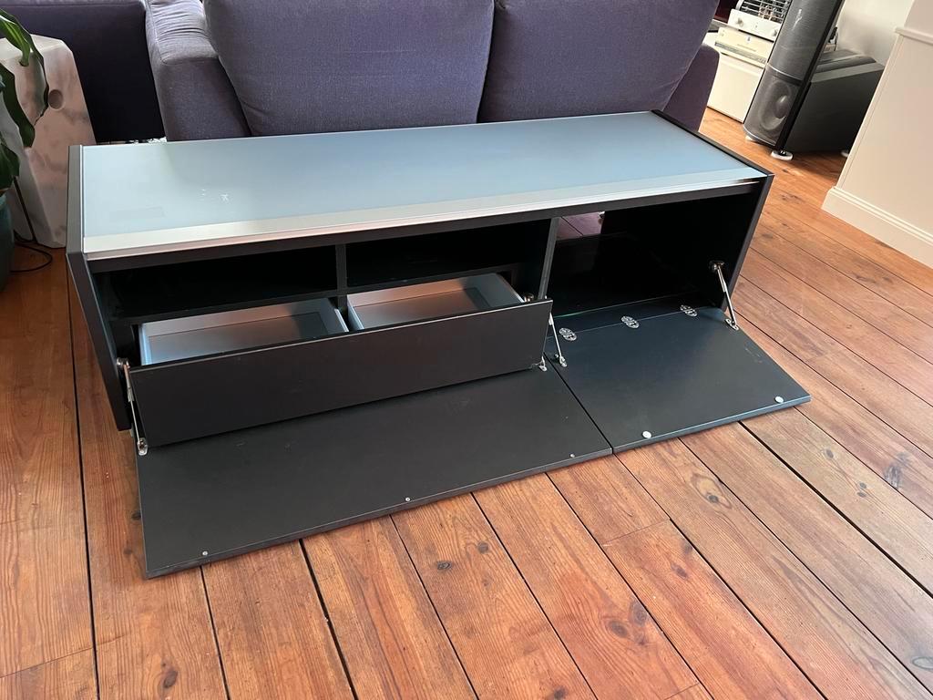 Stevige en zware tv kast met een elegant glazen blad. De kast beschikt over een handige lade en een klep voor extra opbergruimte.