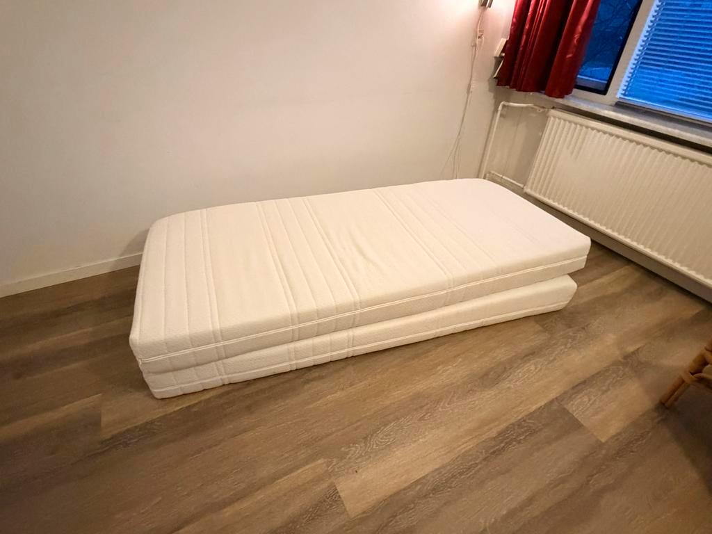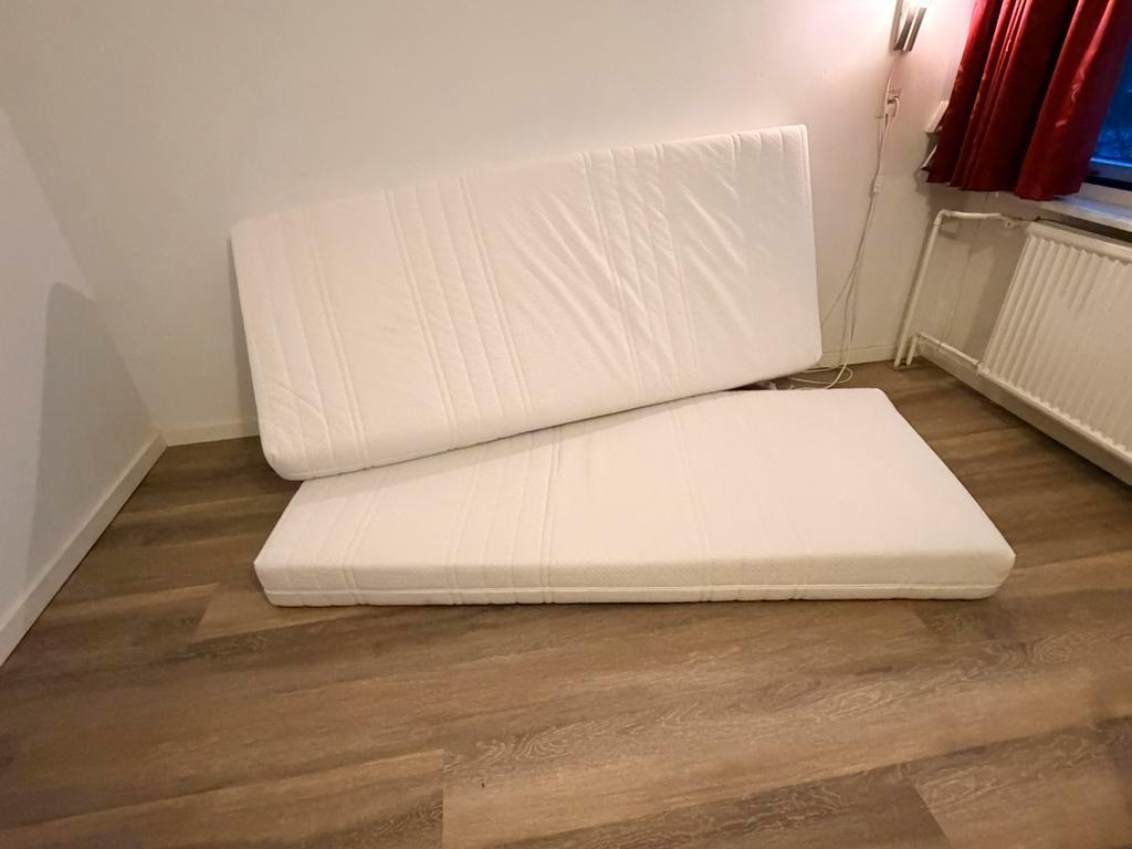 Twee matrassen van 90x200 cm, perfect voor een eenpersoonsbed of logeerbed. Ze zijn in goede staat en bieden een comfortabele nach
