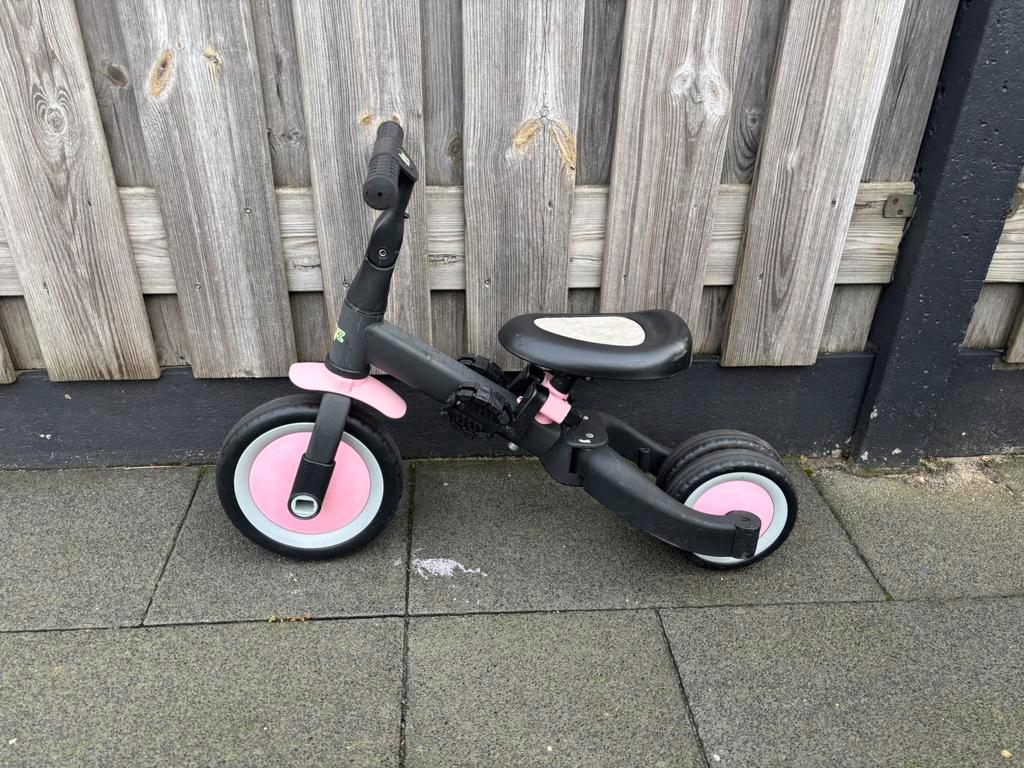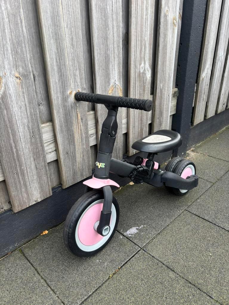 Roze zwart loopfietsje met dubbele achterwielen voor meer stevigheid bij het leren rijden met de loopfiets.