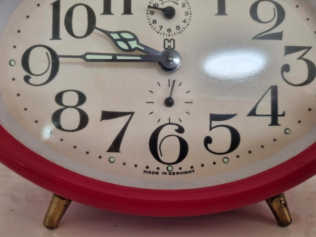 Vintage jerger wekker rood ovaal (6x4-klokplaat) gemaakt in duitsland (lees) geen idee of de alarmfunctie werkt. Gelieve te kopen
