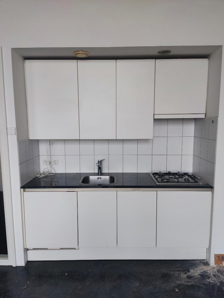 Keukenblok 212 cm breed met hangende kastjes. Afmetingen kastjes: 60-45-45-60 cm. Inclusief vaatwasser (45 cm breed), koelkast (60