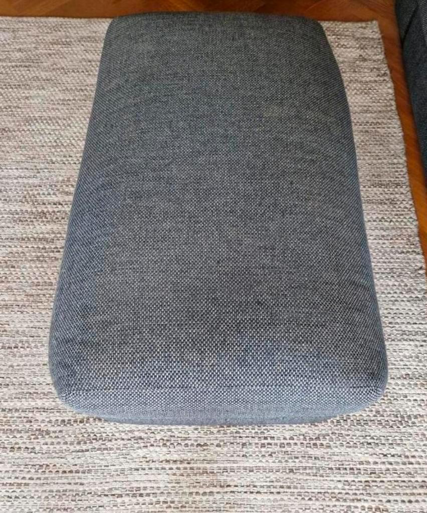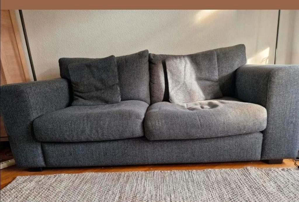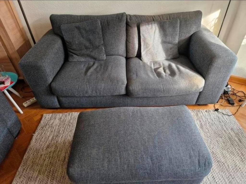 Comfortabele bank met bijpassende poef/hocker. De bank is in goede staat en biedt plaats aan twee of drie personen. De poef kan ge