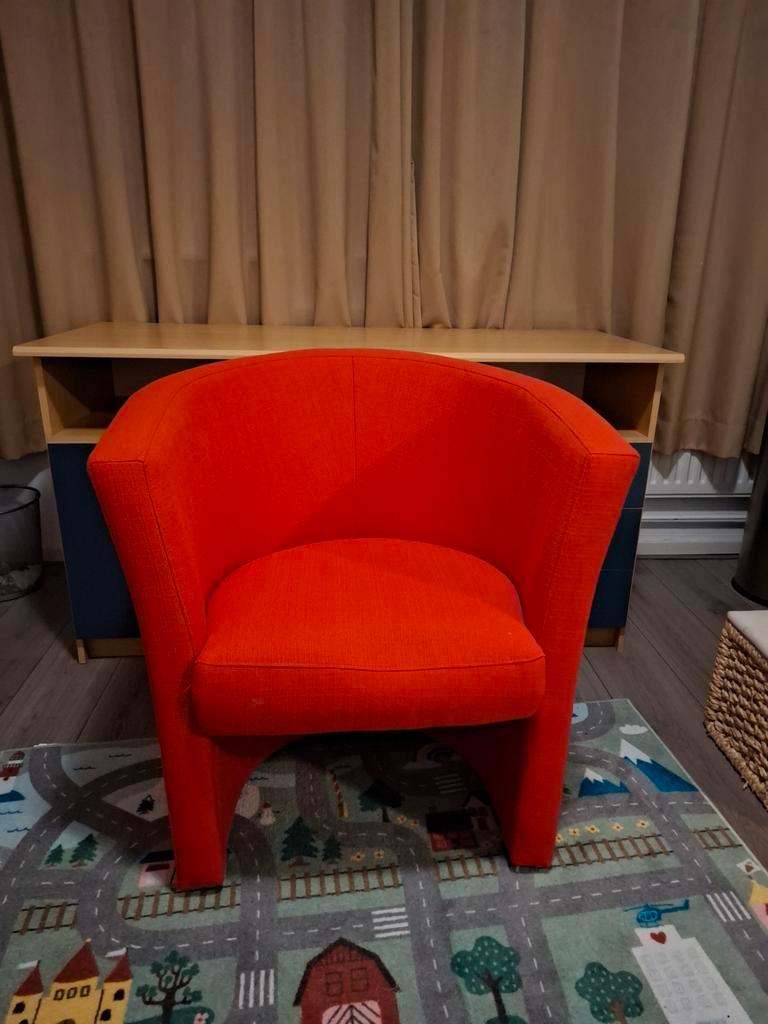 Een comfortabele rode fauteuil. De fauteuil is bekleed met stof en heeft een unieke stijl. Gratis ophalen in winschoten