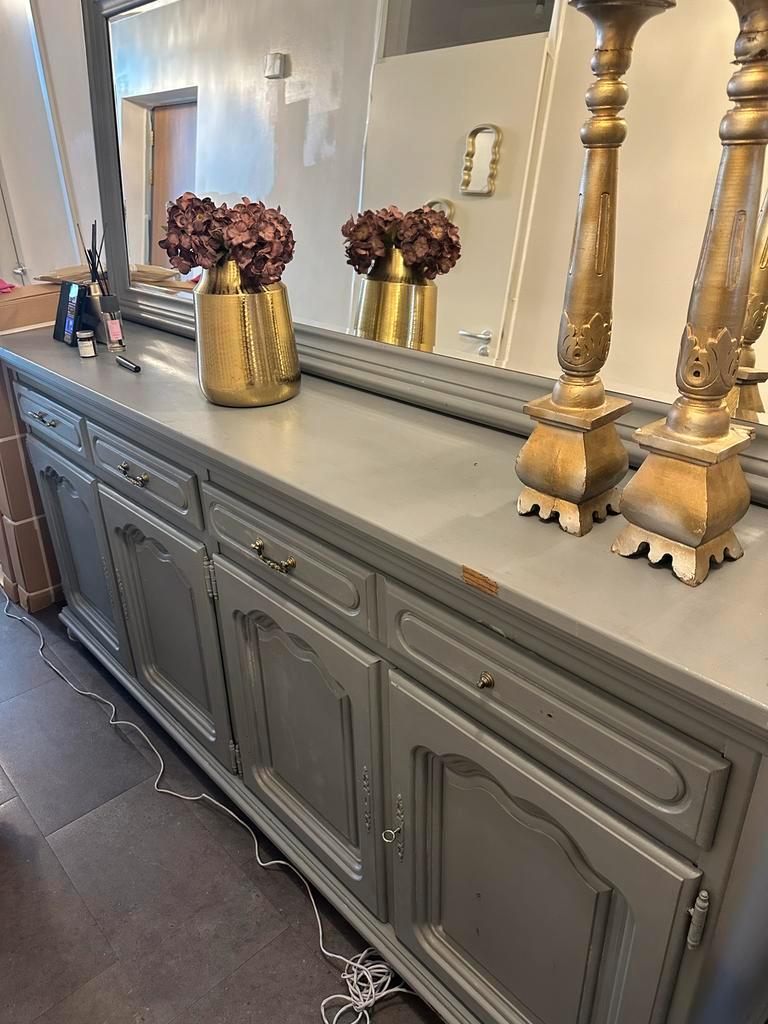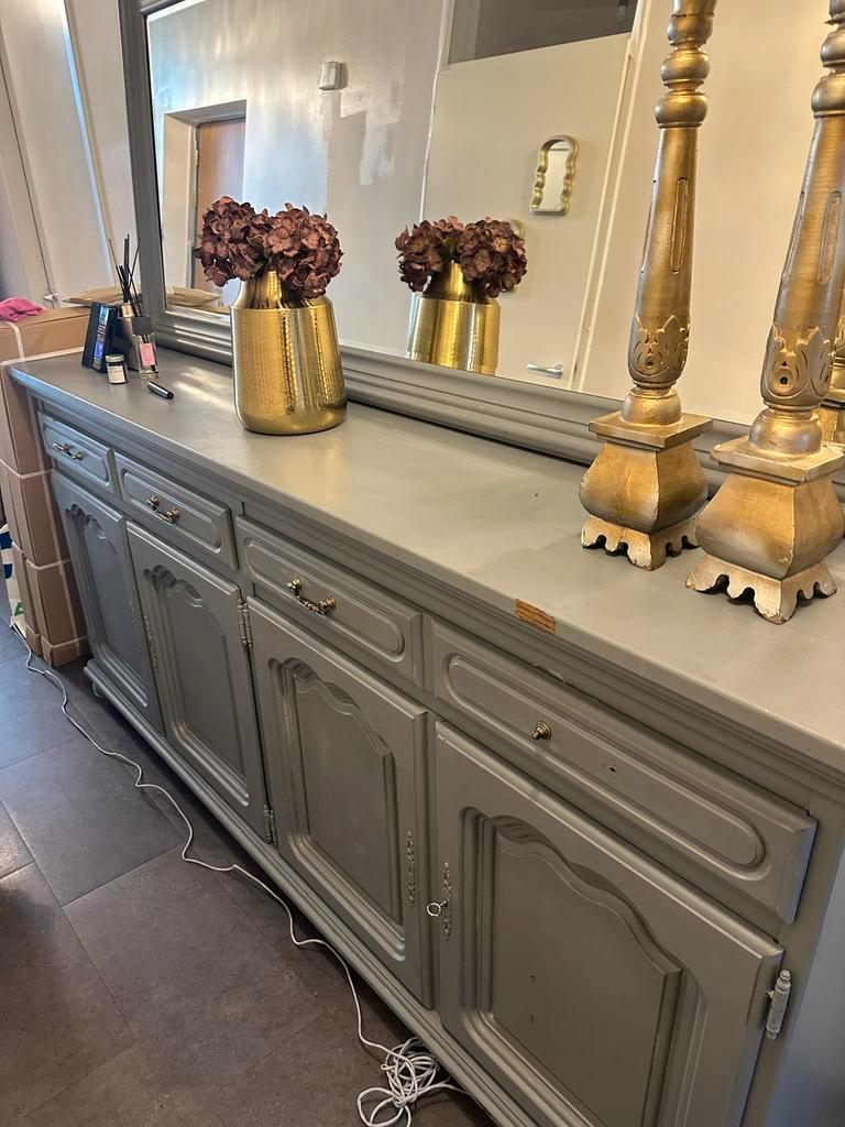 Mooie grijze buffetkast met veel opbergruimte. De kast heeft zowel deuren als lades, waardoor er genoeg ruimte is voor al je spull