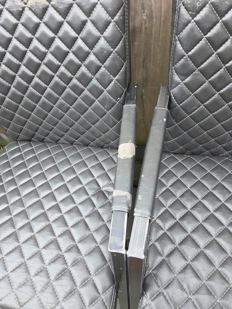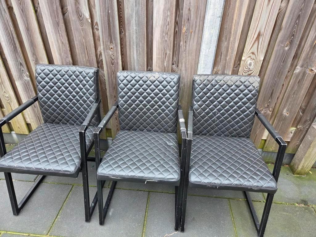 Een set van 4 zwarte stoelen. De stoelen zijn nog stevig, maar de bekleding is versleten en niet mooi meer. Ideaal voor iemand die