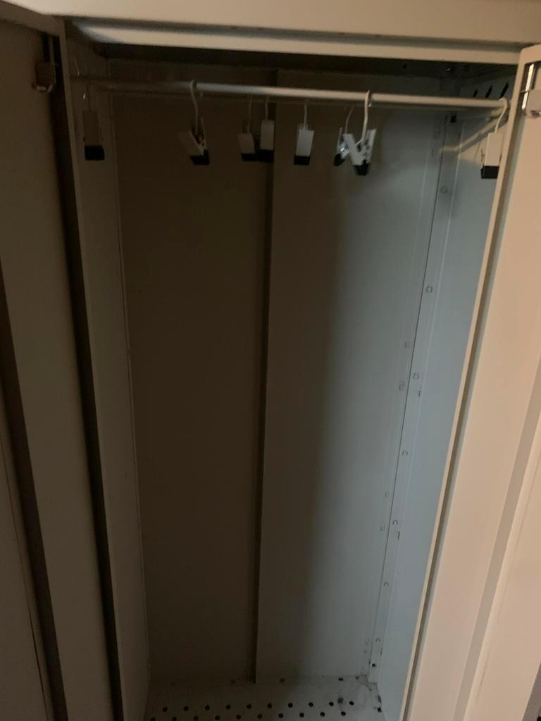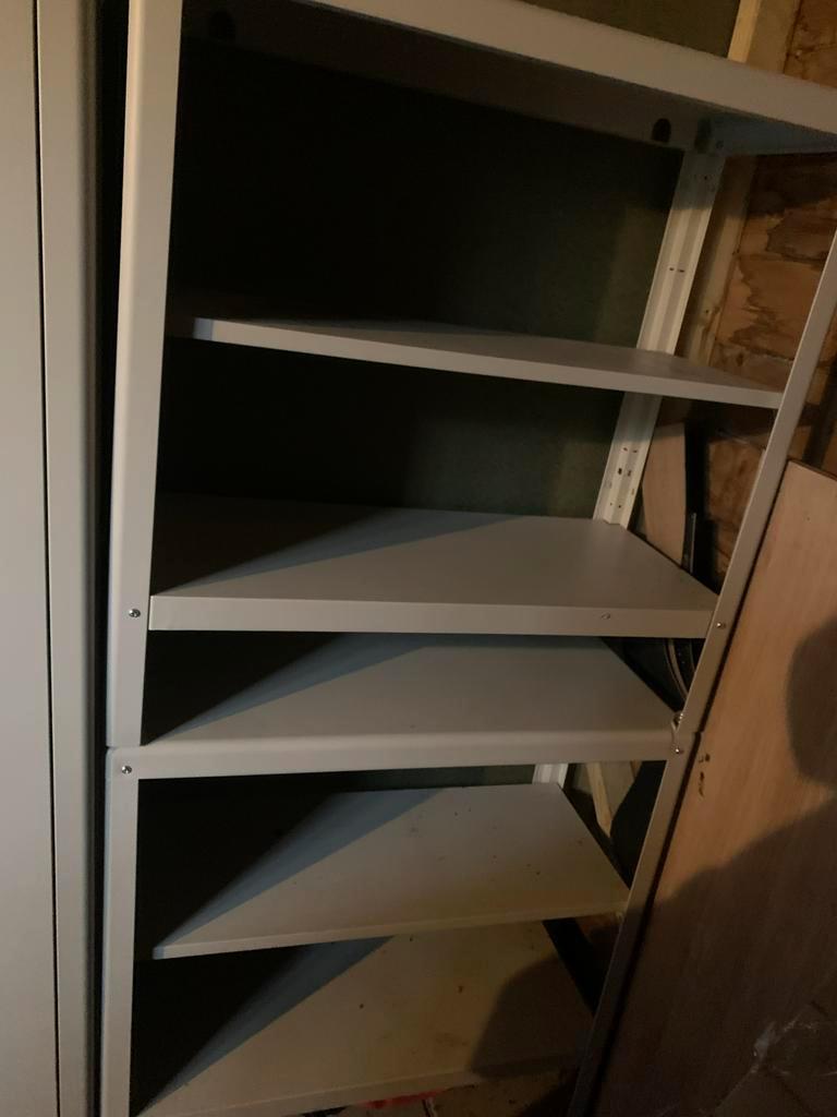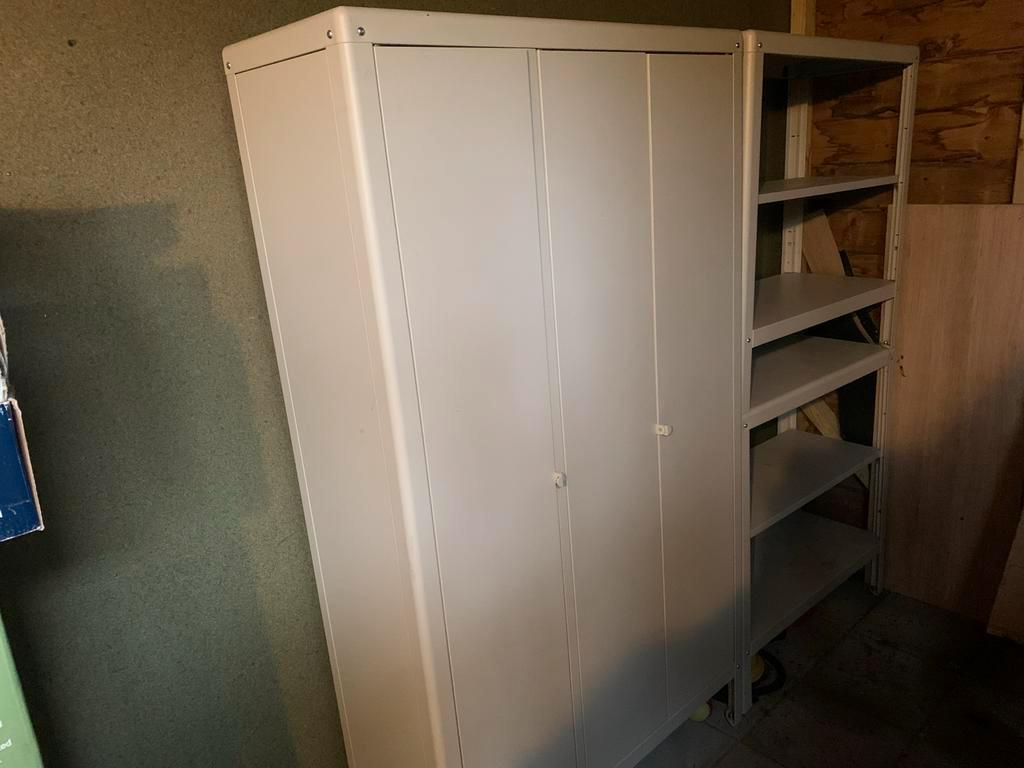 Stevige metalen stellingkast van de ikea, ideaal voor opslag. De kast is voorzien van deuren en planken, waardoor je spullen netje