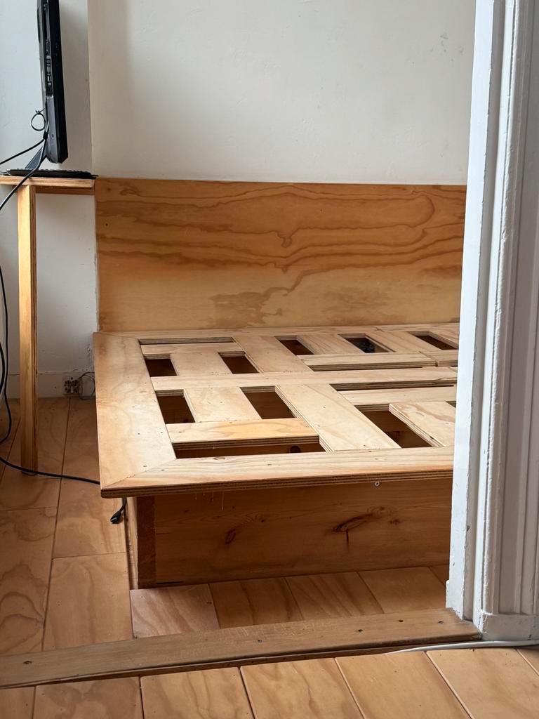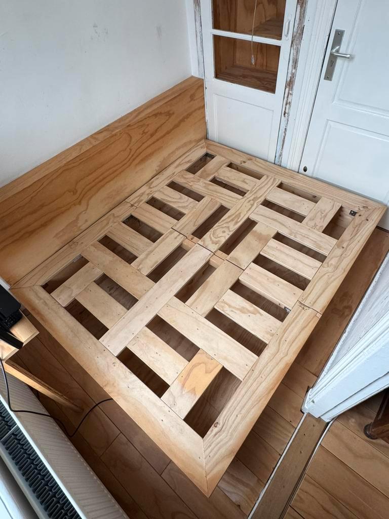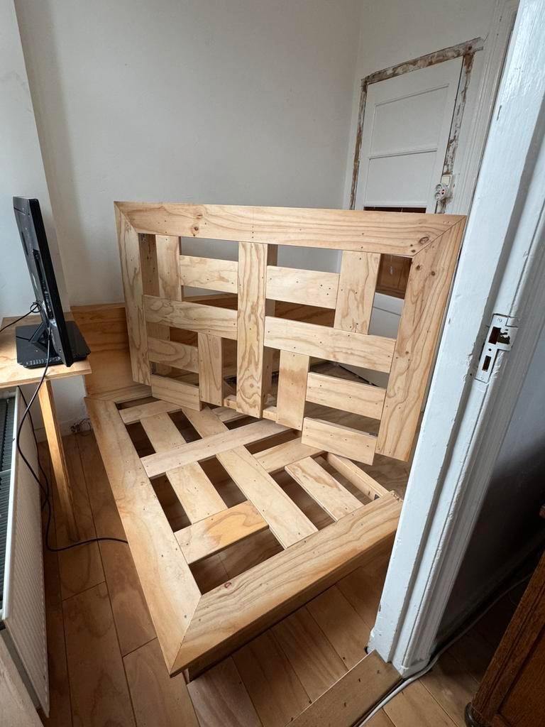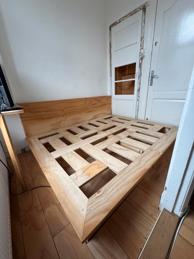 Tweepersoonsbed van 200x160cm gemaakt van resthout dat tijdens een verbouwing overbleef. Zeer degelijk en netjes in elkaar gezet.