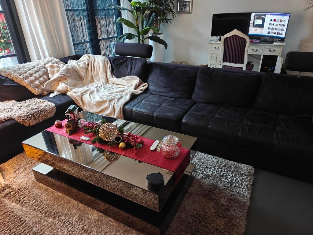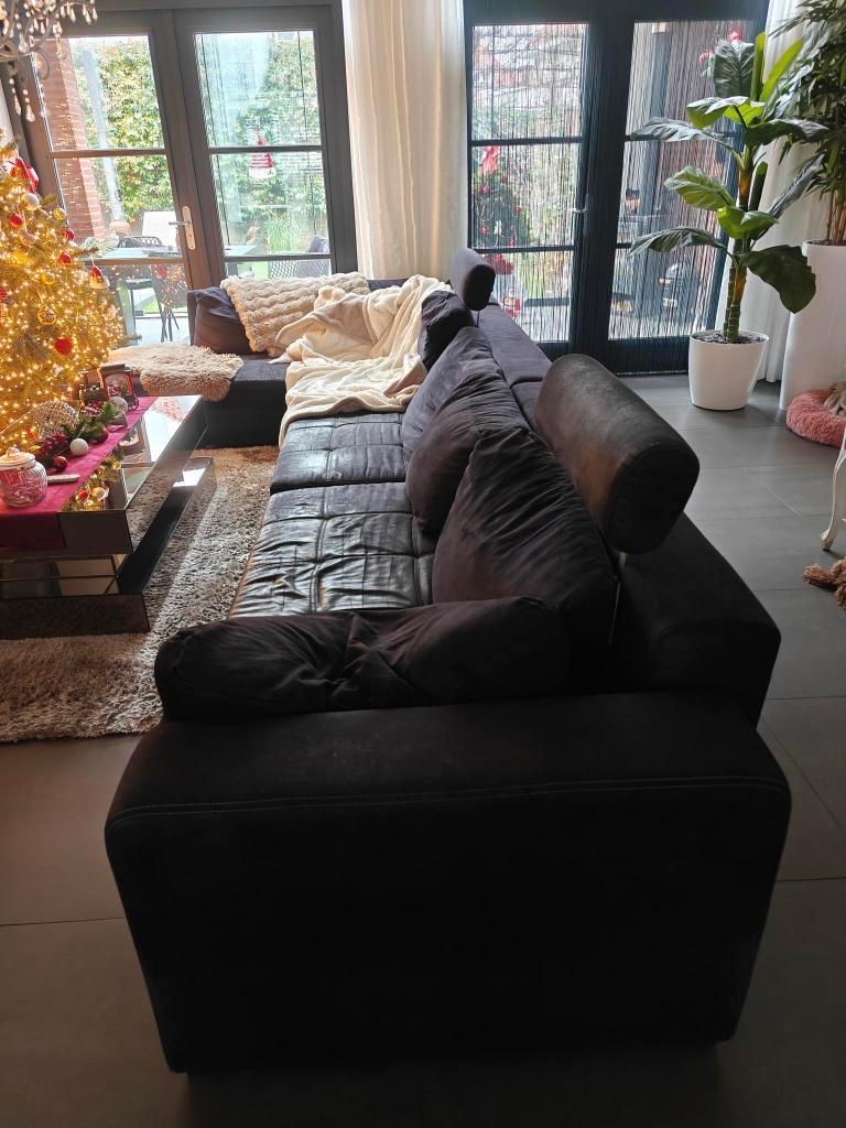 Grote zwarte hoekbank goed zuiver te houden stof. Groote: 420 cm x 220 cm zitgedeelte hoogte: 38 cm zitgedeelte diepte: 80 cm 2 ui