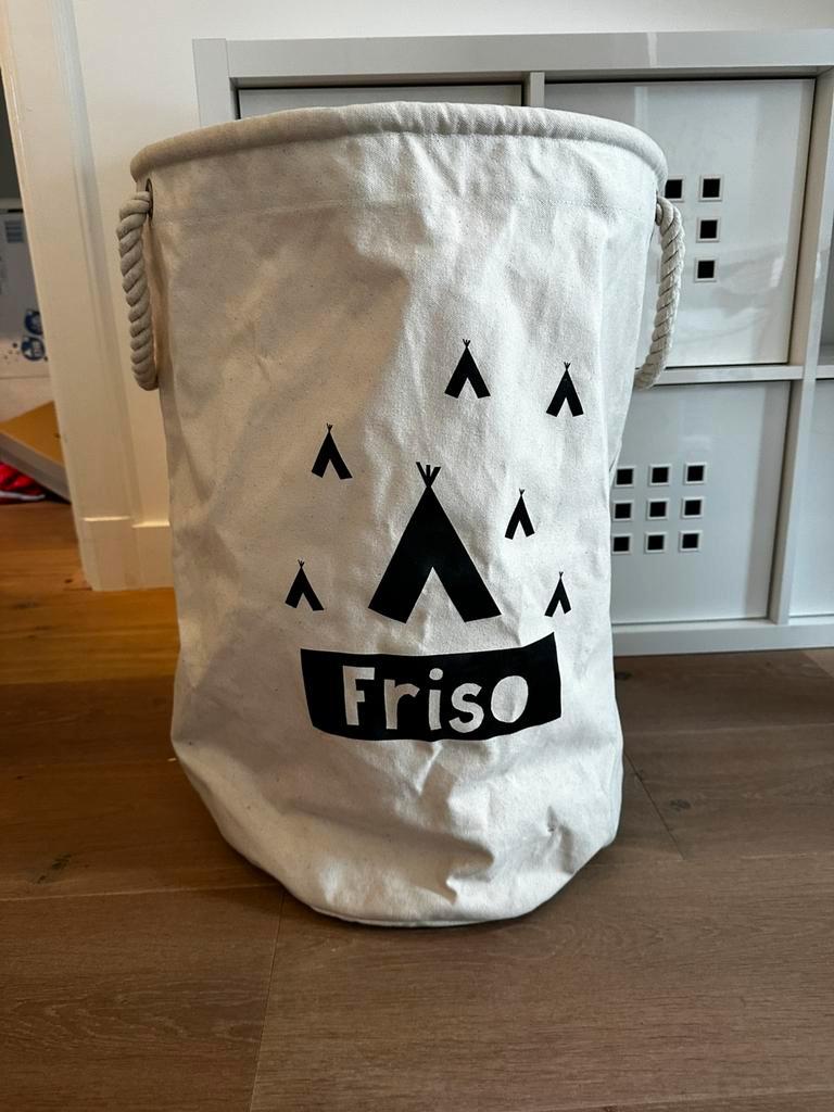 Leuk voor op een kinderkamer: grote katoenen (was)zak / opbergmand met de naam friso erop. Er hebben bij ons verkleedkleren in gez