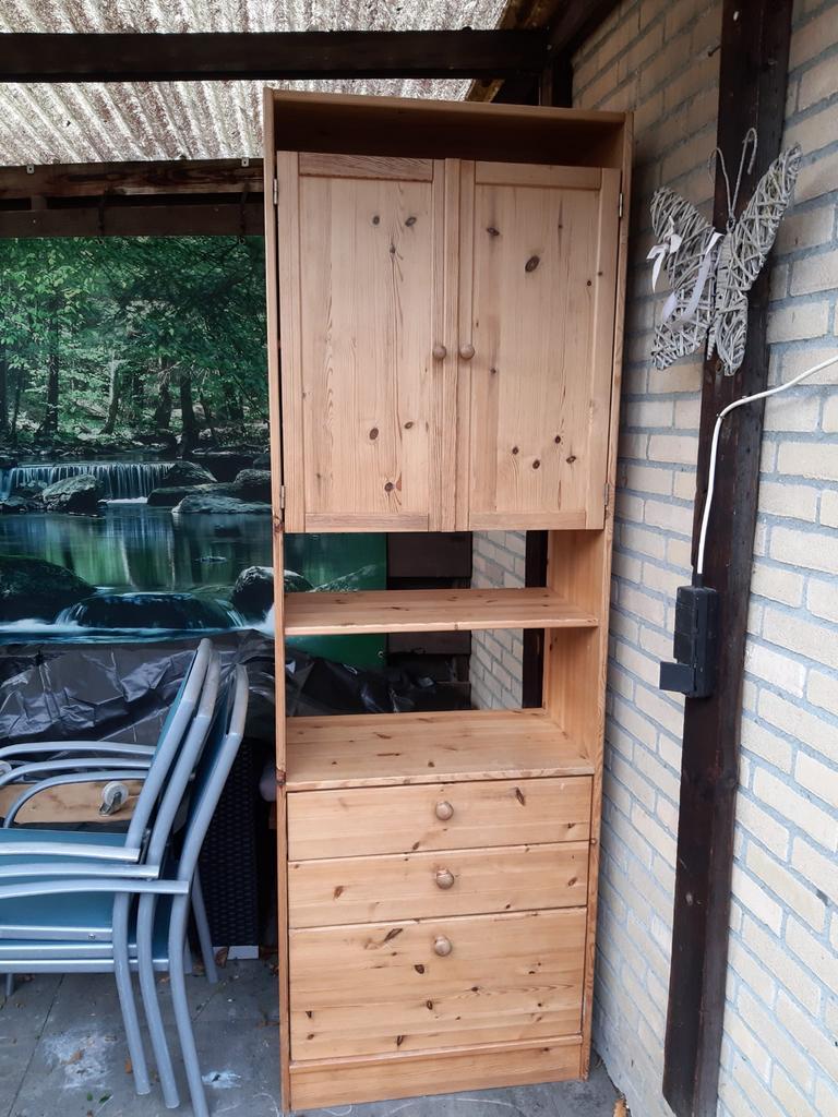 Een gebruikt houten kastje met deurtjes aan de bovenkant en lades aan de onderkant. Ideaal voor extra opbergruimte. Gebruikssporen